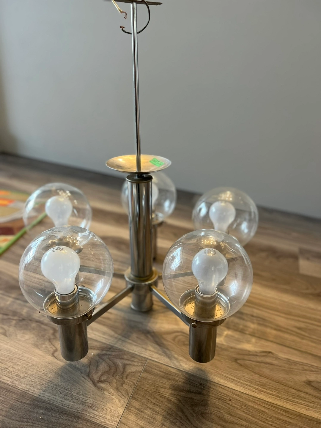 Features clear glass globes. Five arms extend from a central rod. Polished metallic finish. Perfect to create a warm and inviting ambiance in your home.