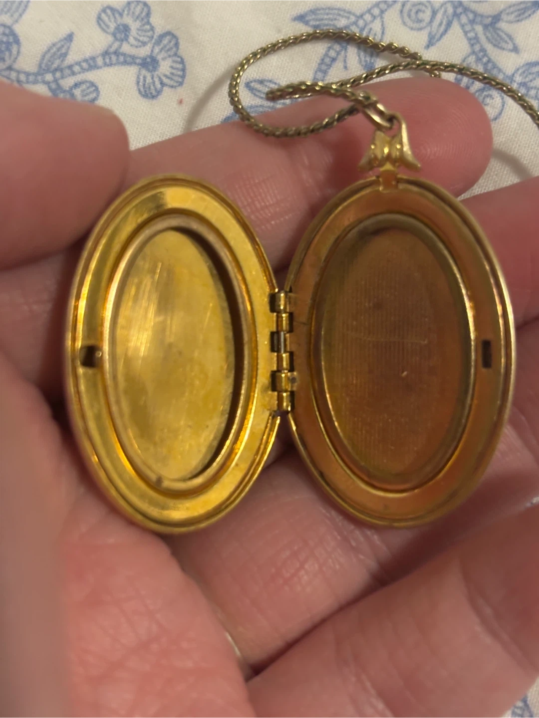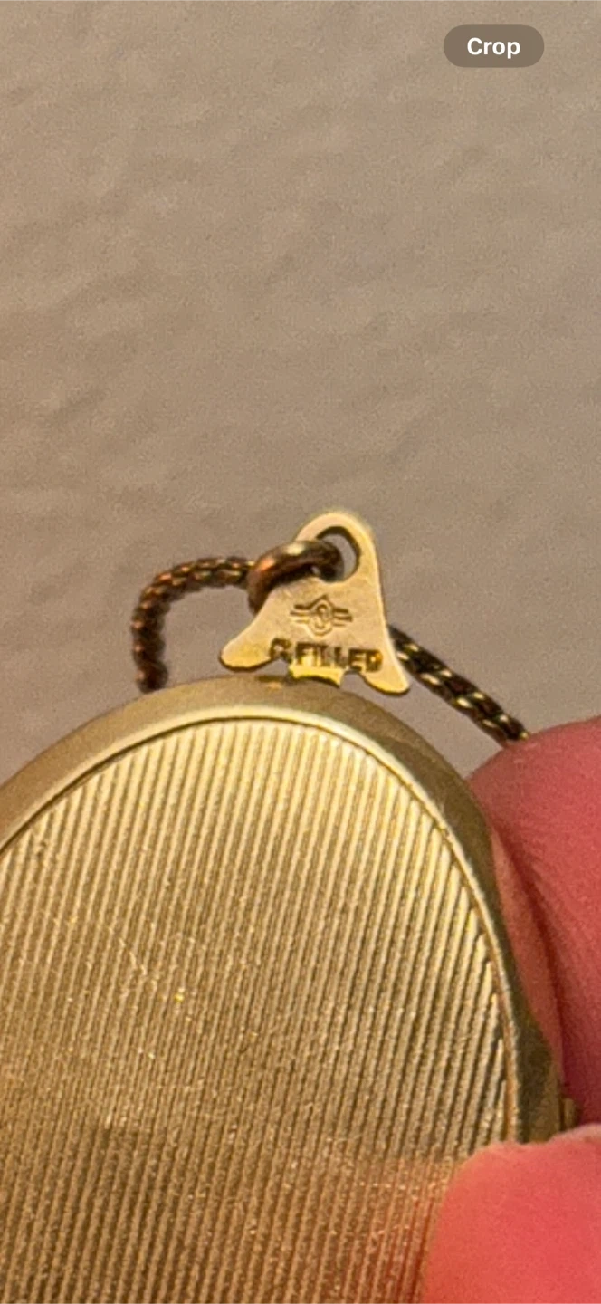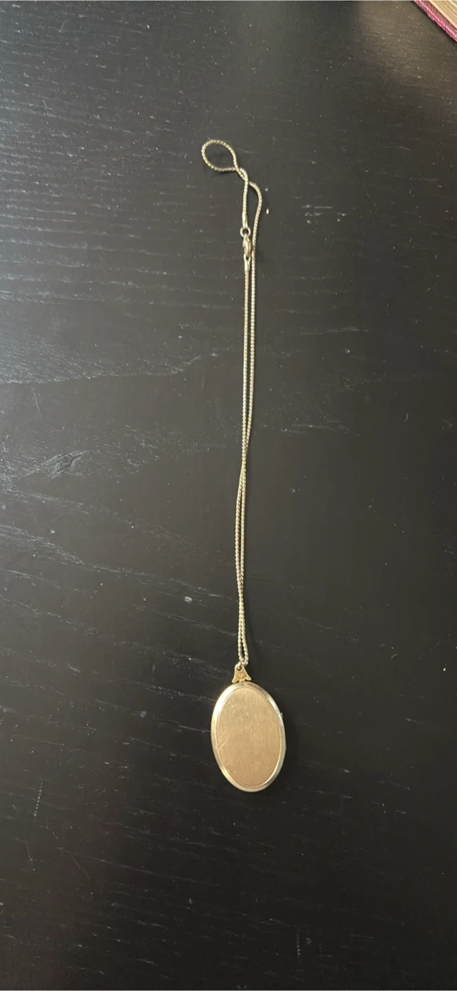 Selling a vintage gold-filled locket necklace. It has an oval shape and opens up to hold photos or mementos. The locket is attached to a delicate chain.