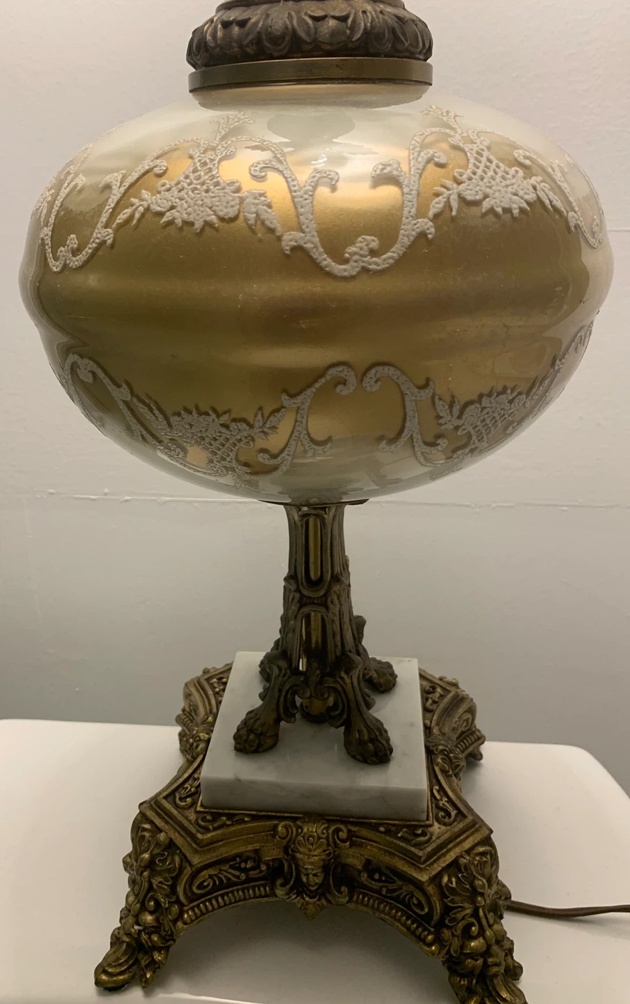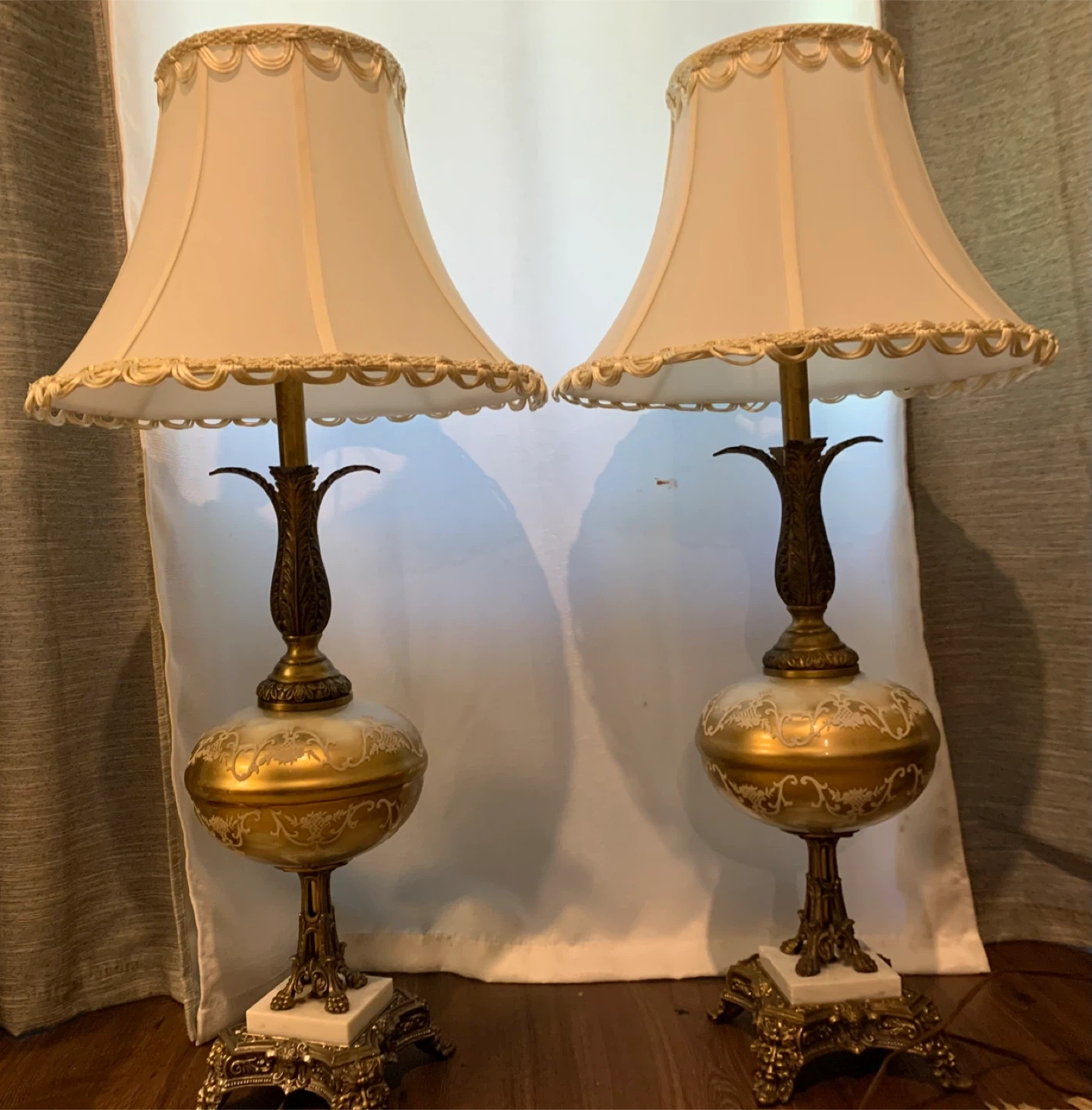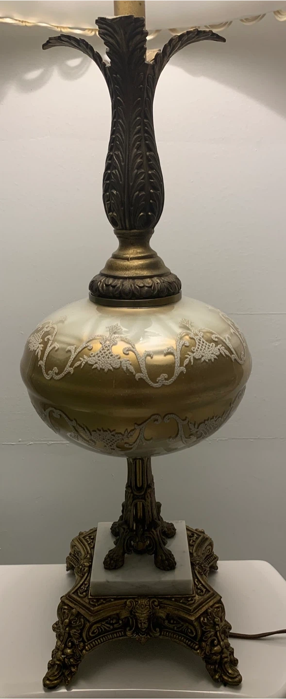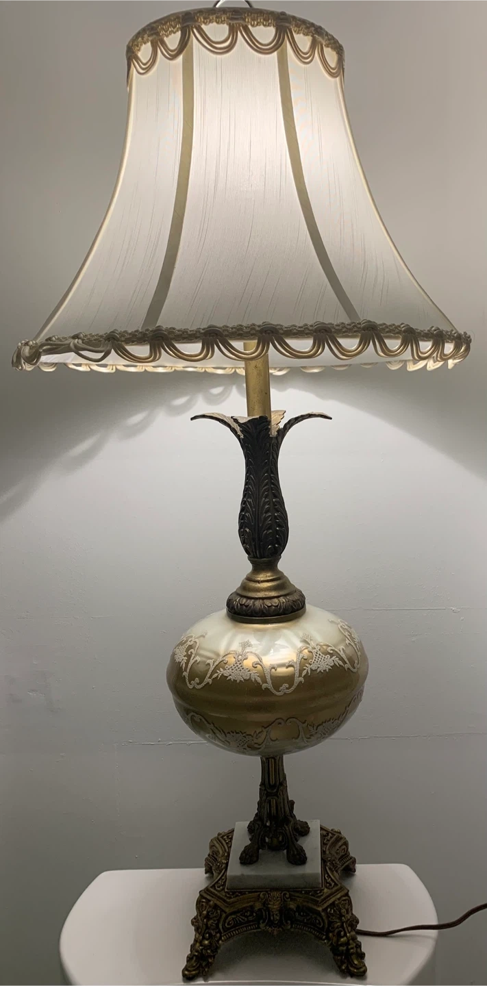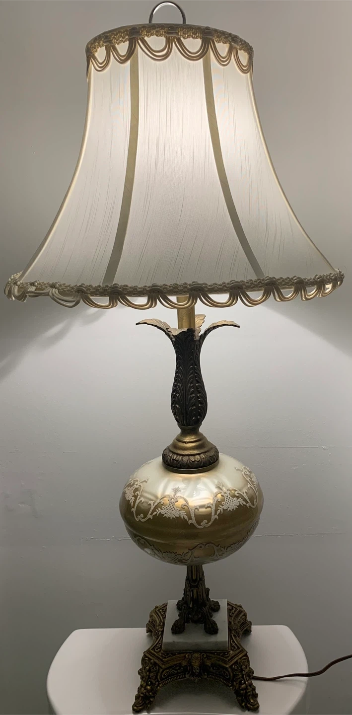 Beautiful vintage-style table lamp. It features a unique design with a decorative base and a lovely shade. It would make a great addition to any room! Two lamps available