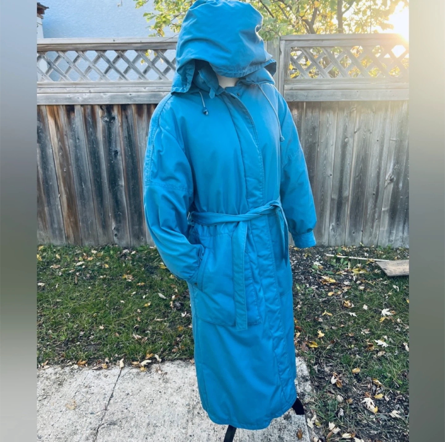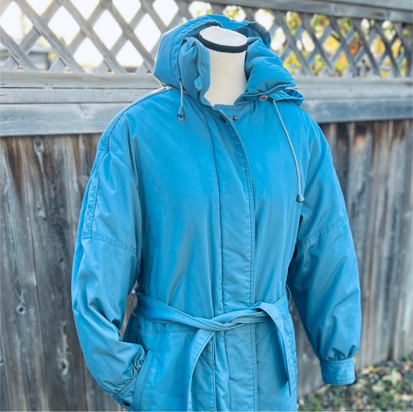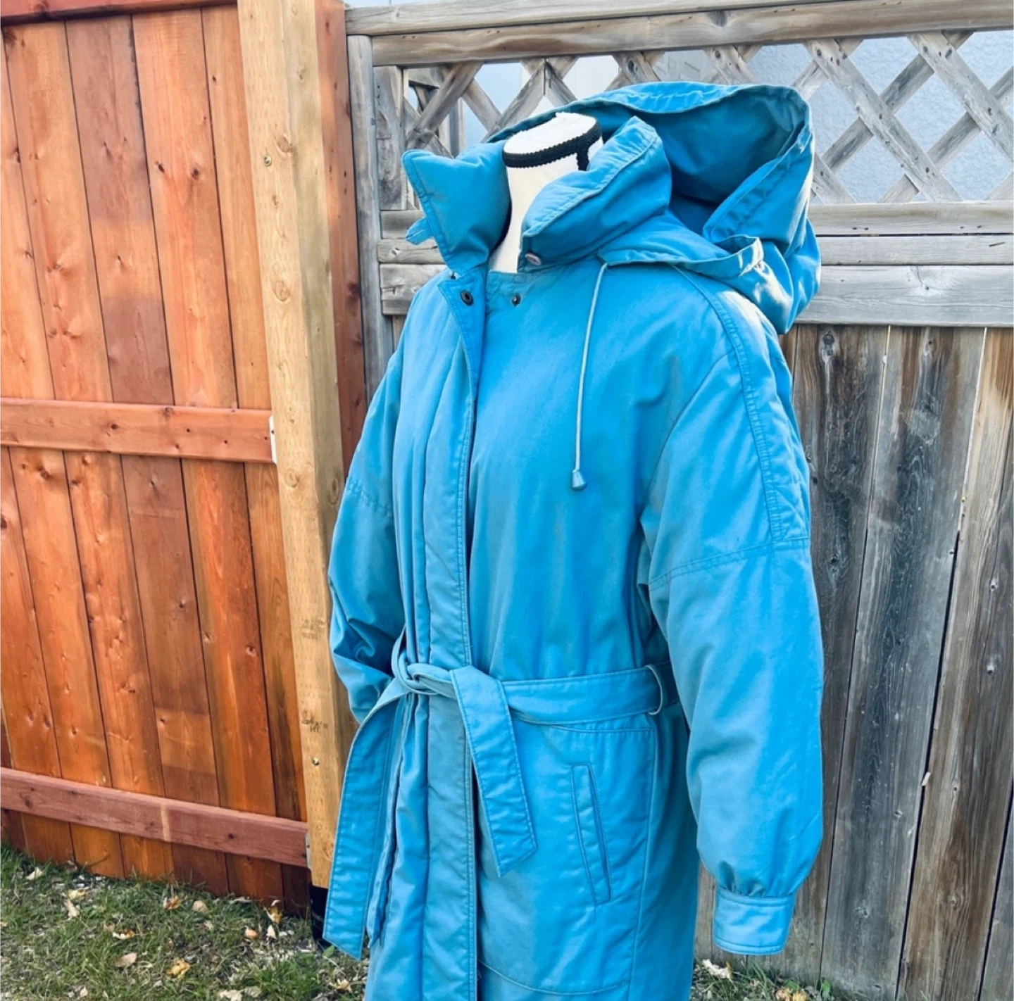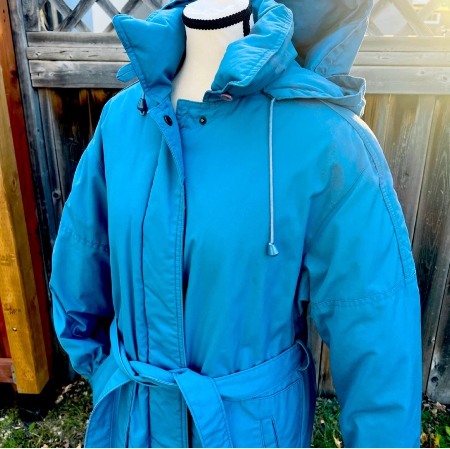 Here's a lovely blue belted puffer coat! It features a removable hood and a tie around the waist. Perfect for staying warm and stylish. Size 10 65% Polyester, 35% Cotton. Lining 100% Nylon Fill 80% Goose Down, 20% Water Fowl Feathers