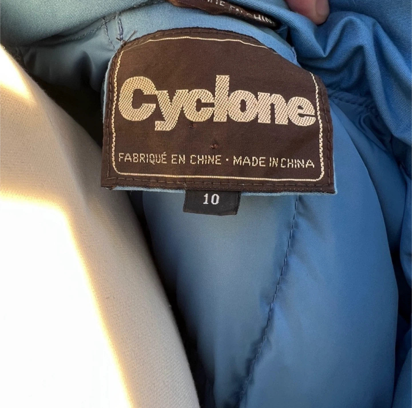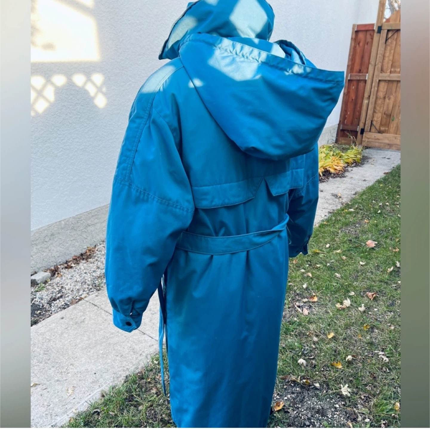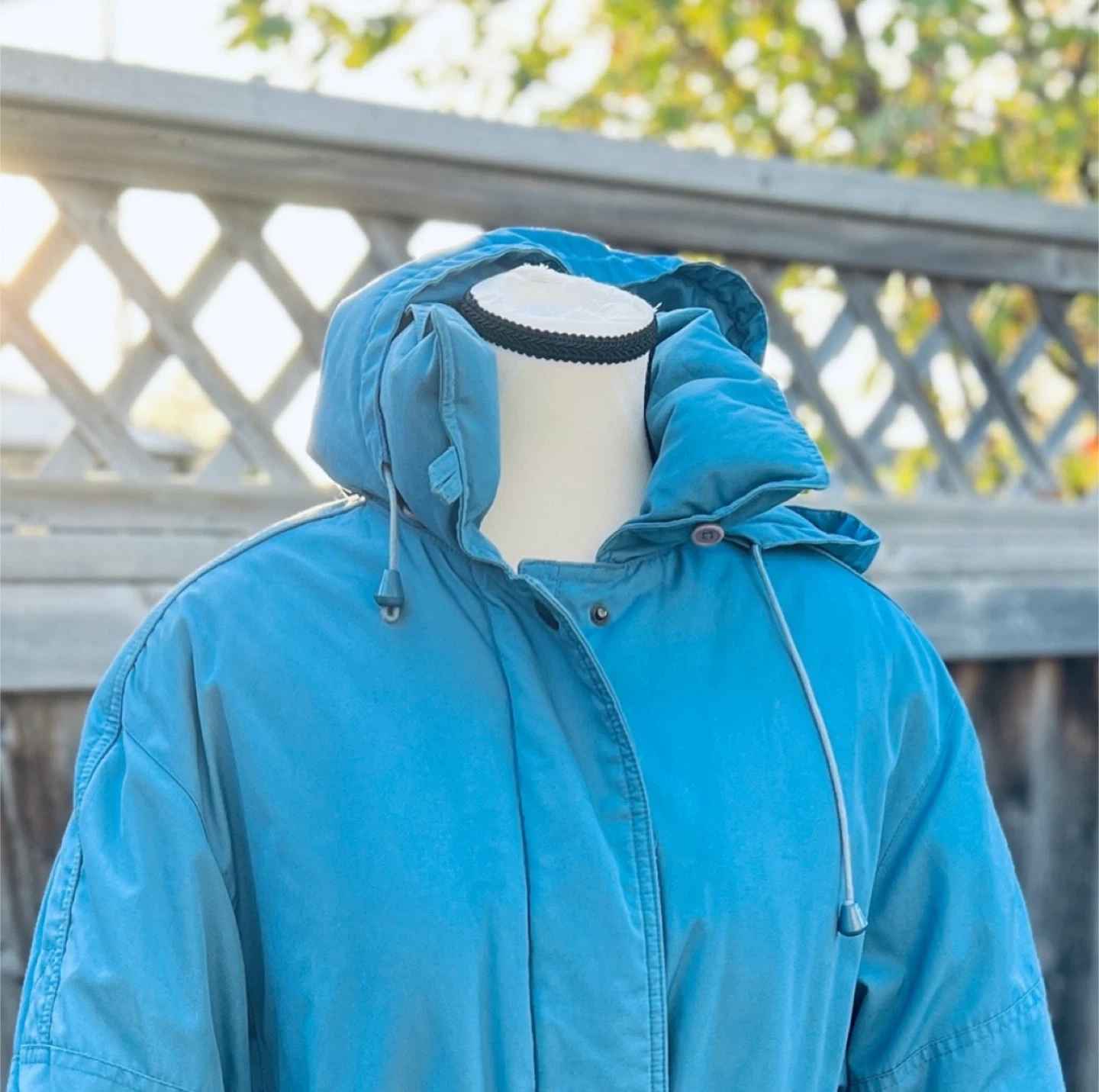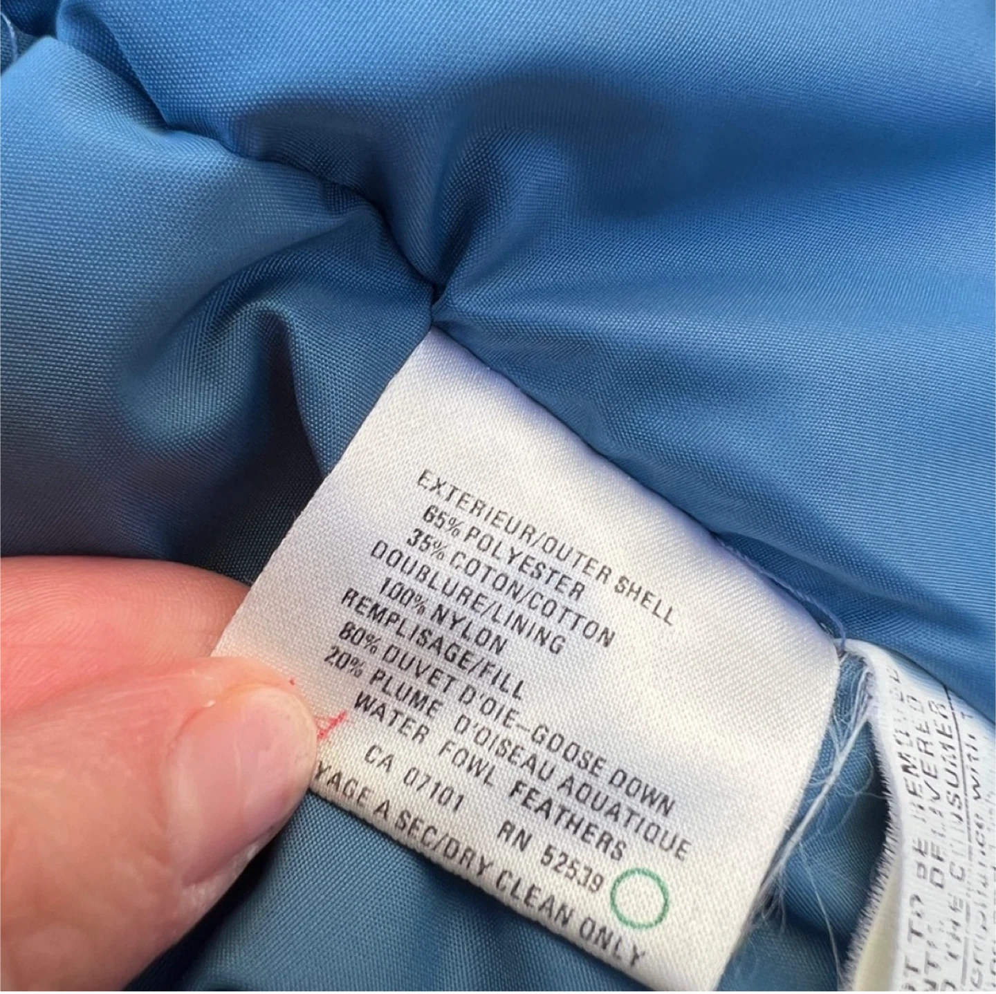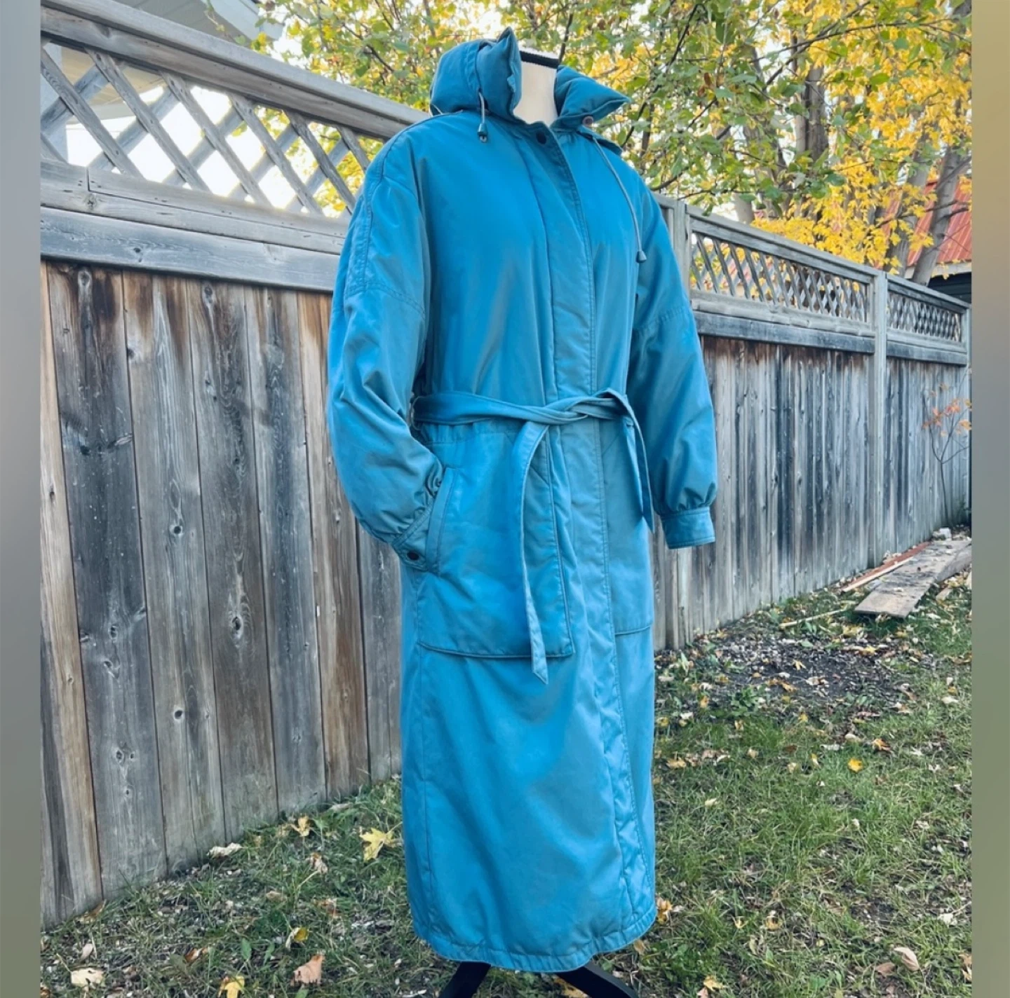 Here's a lovely blue belted puffer coat! It features a removable hood and a tie around the waist. Perfect for staying warm and stylish. Size 10 65% Polyester, 35% Cotton. Lining 100% Nylon Fill 80% Goose Down, 20% Water Fowl Feathers