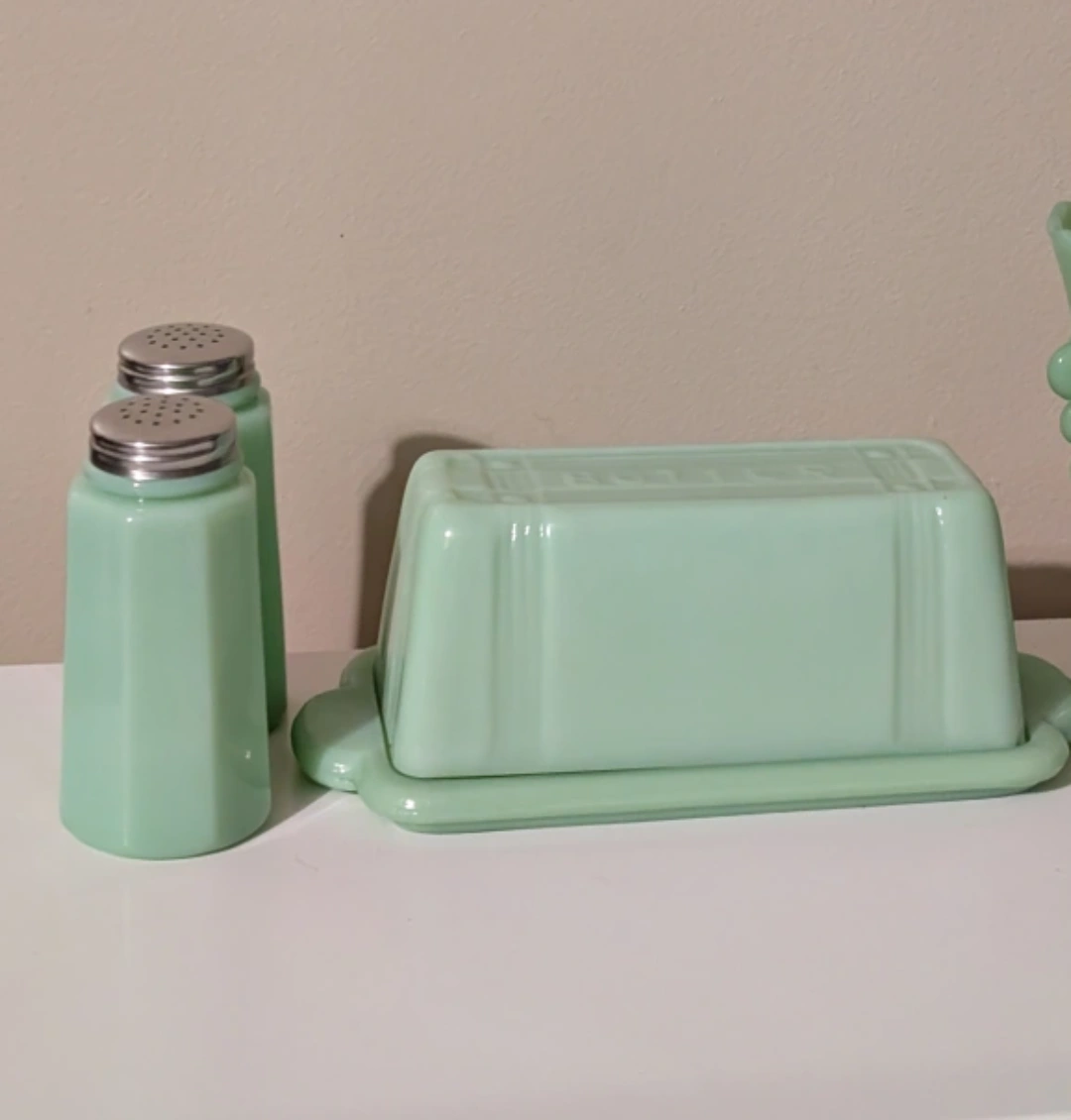 Set of vintage jadeite green Depression glass kitchenware. Includes salt and pepper shakers, butter dish with lid. Excellent for collectors or adding a vintage touch to your kitchen.