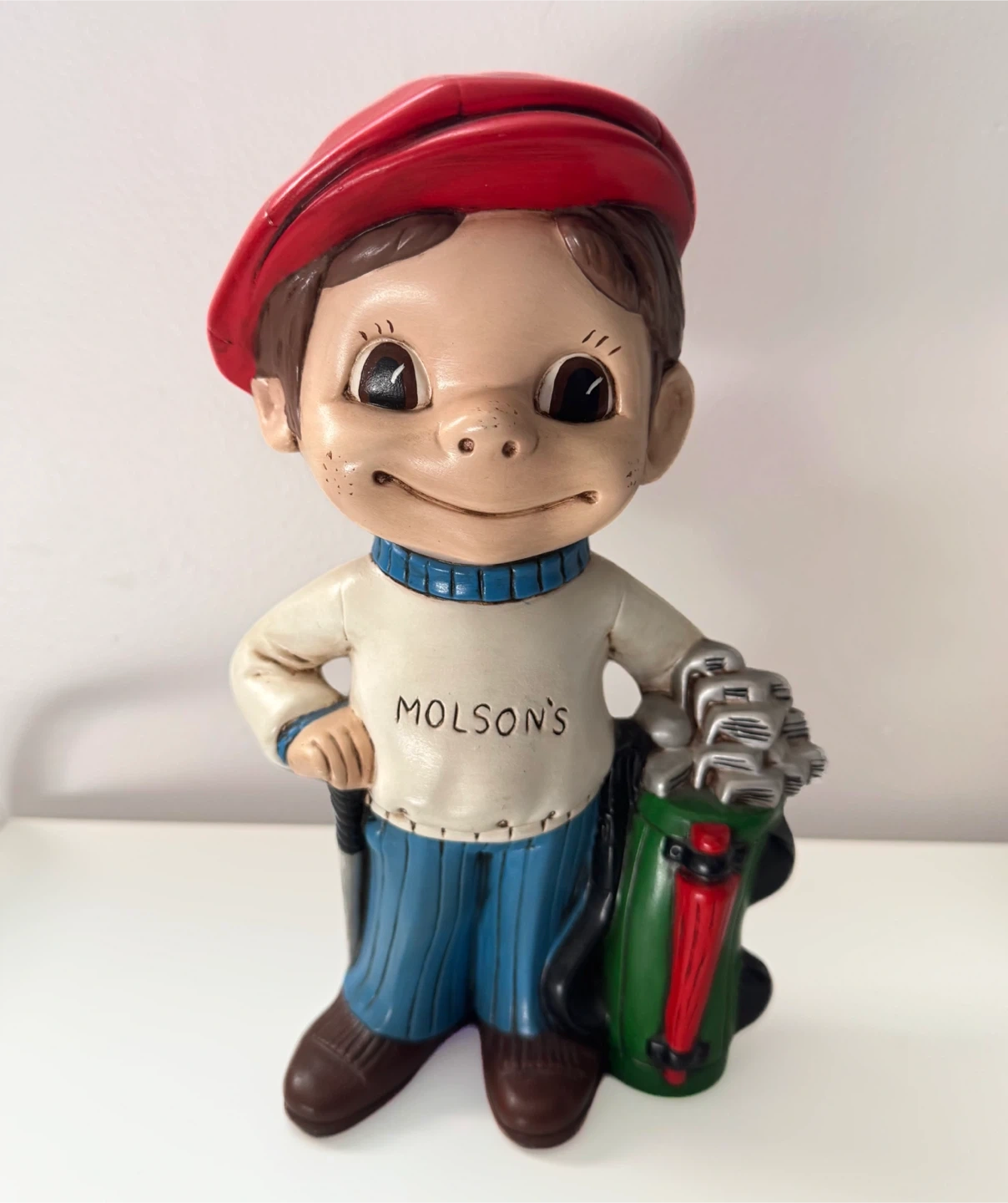 70Here's a charming vintage figurine from 1977! It features a cute golfer wearing a red cap and a Molson's sweater. The base is signed "Wayne". A great piece for collectors or anyone who loves vintage decor. ~ 10inch height