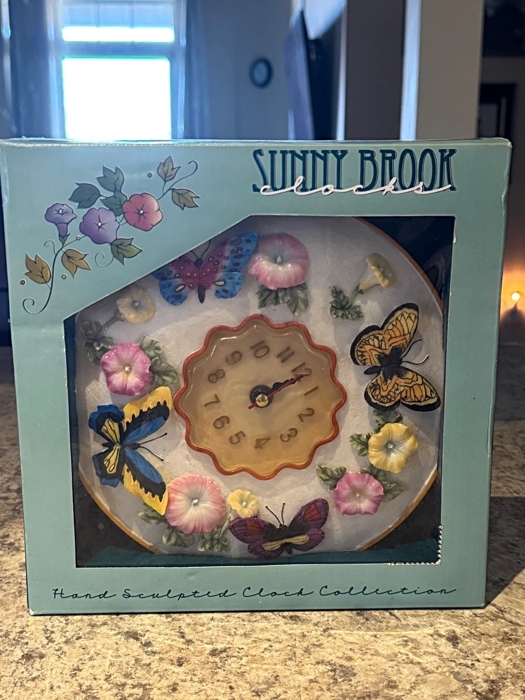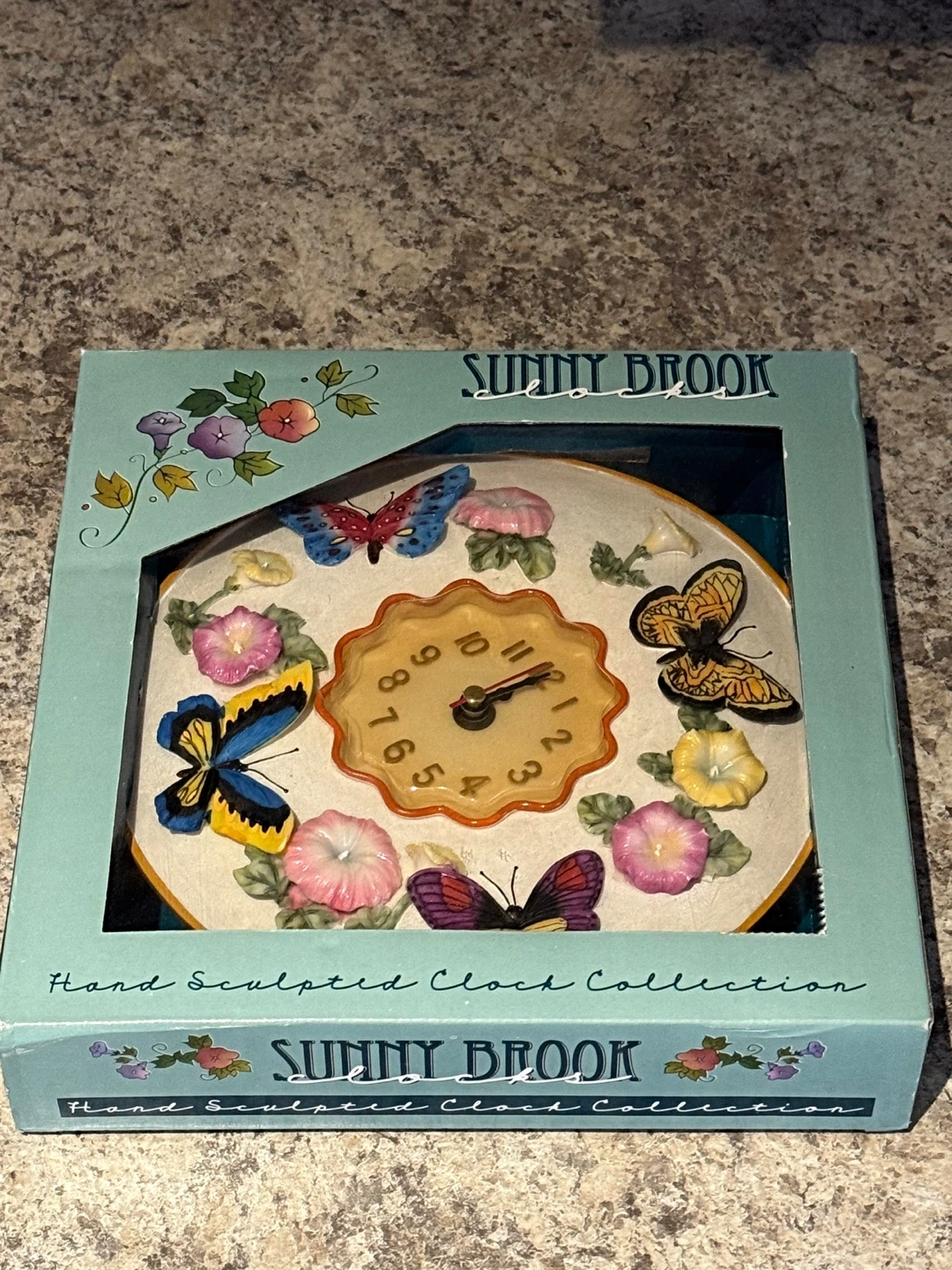 61Selling a Sunny Brook vintage hand-sculpted clock. It features a charming design with butterflies and flowers. Perfect for adding a touch of whimsy to any room! New and still in box. CASH ONLY PICK UP ONLY