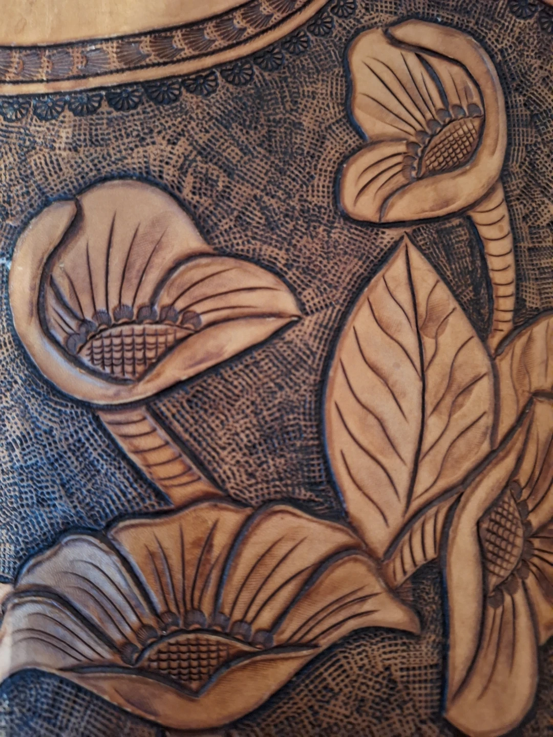 71Unique hand-tooled leather tote bag featuring a beautiful floral design. This bag is perfect for adding a touch of rustic charm to your outfit.