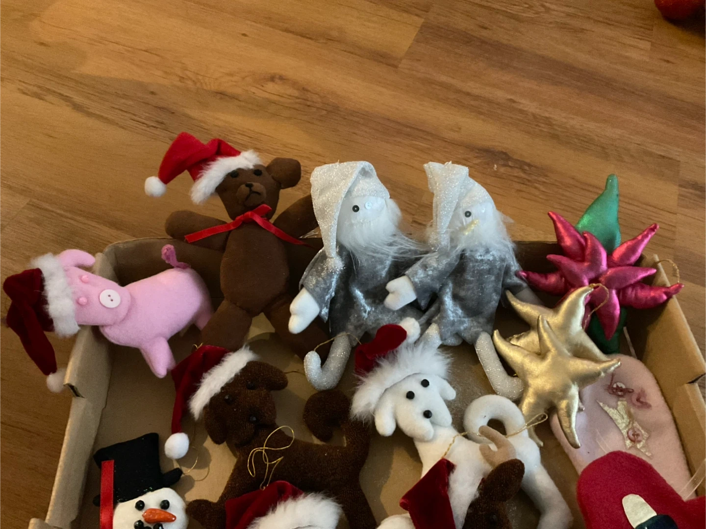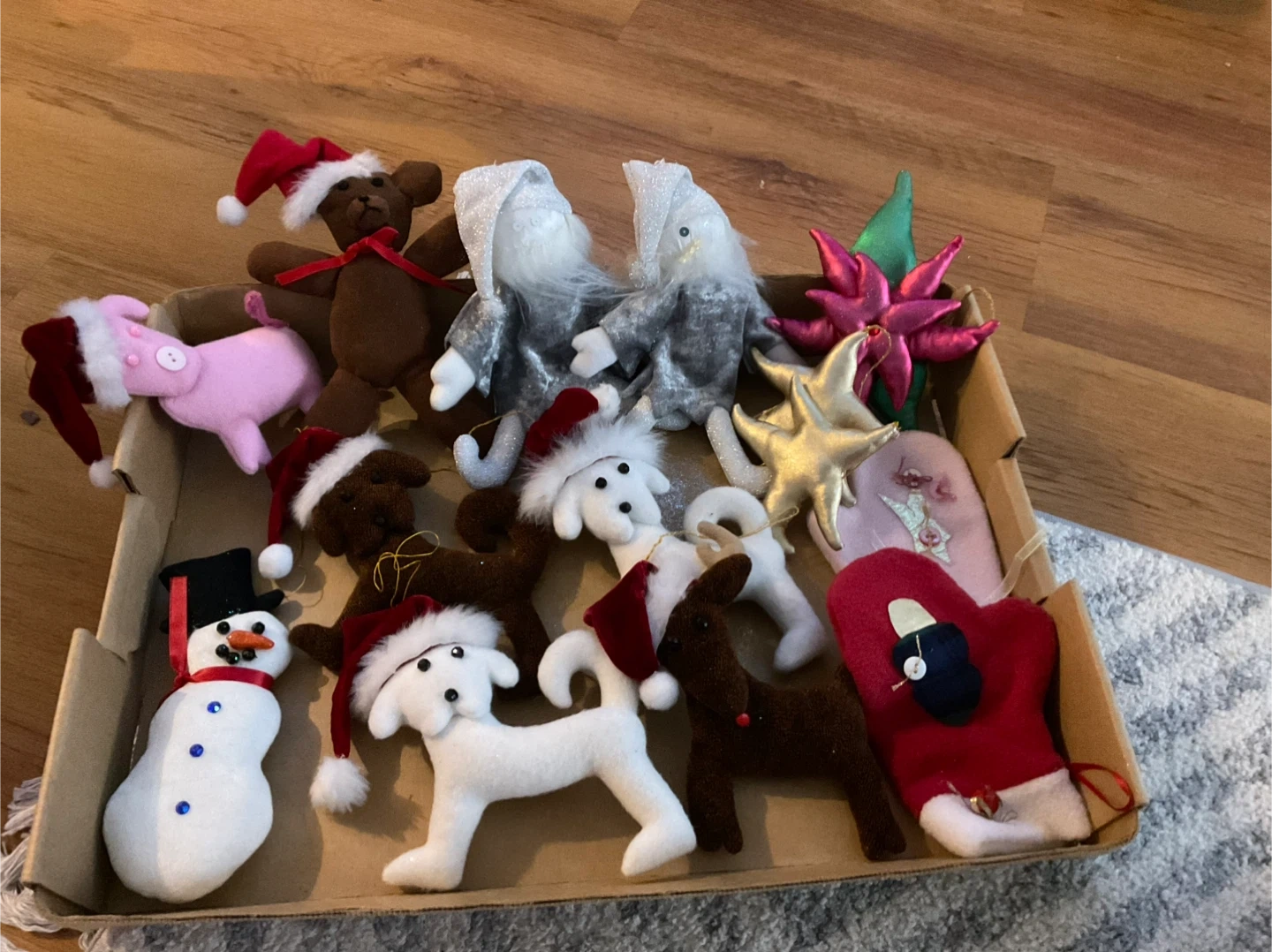 10A mixed lot of cute Christmas ornaments! Includes snowmen, dogs with Santa hats, reindeer, and more. Perfect for decorating your tree or adding some festive cheer to your home. Pink mitten is not included. All are handmade from Grandmas’ collection.