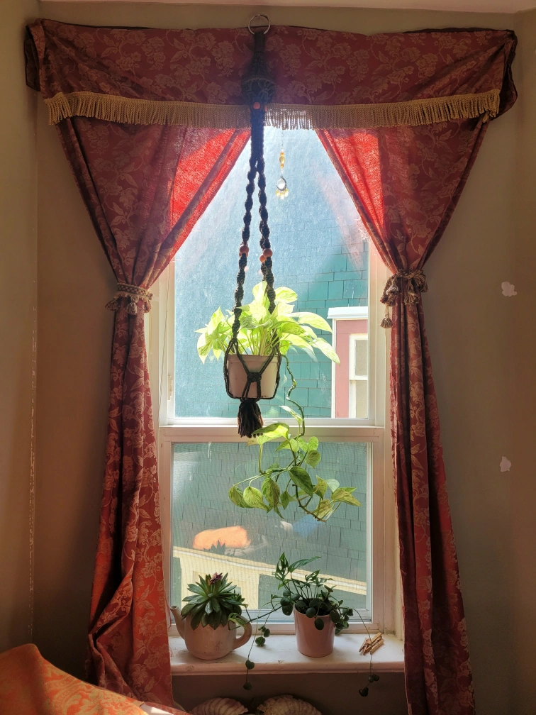 38Two matching red and gold floral patterned curtains with gold tassels. Handmade. You can put curtains rods through them. There is also extra fabric which I'veused to tie them up. $50 for both 51" Wide 89" Long