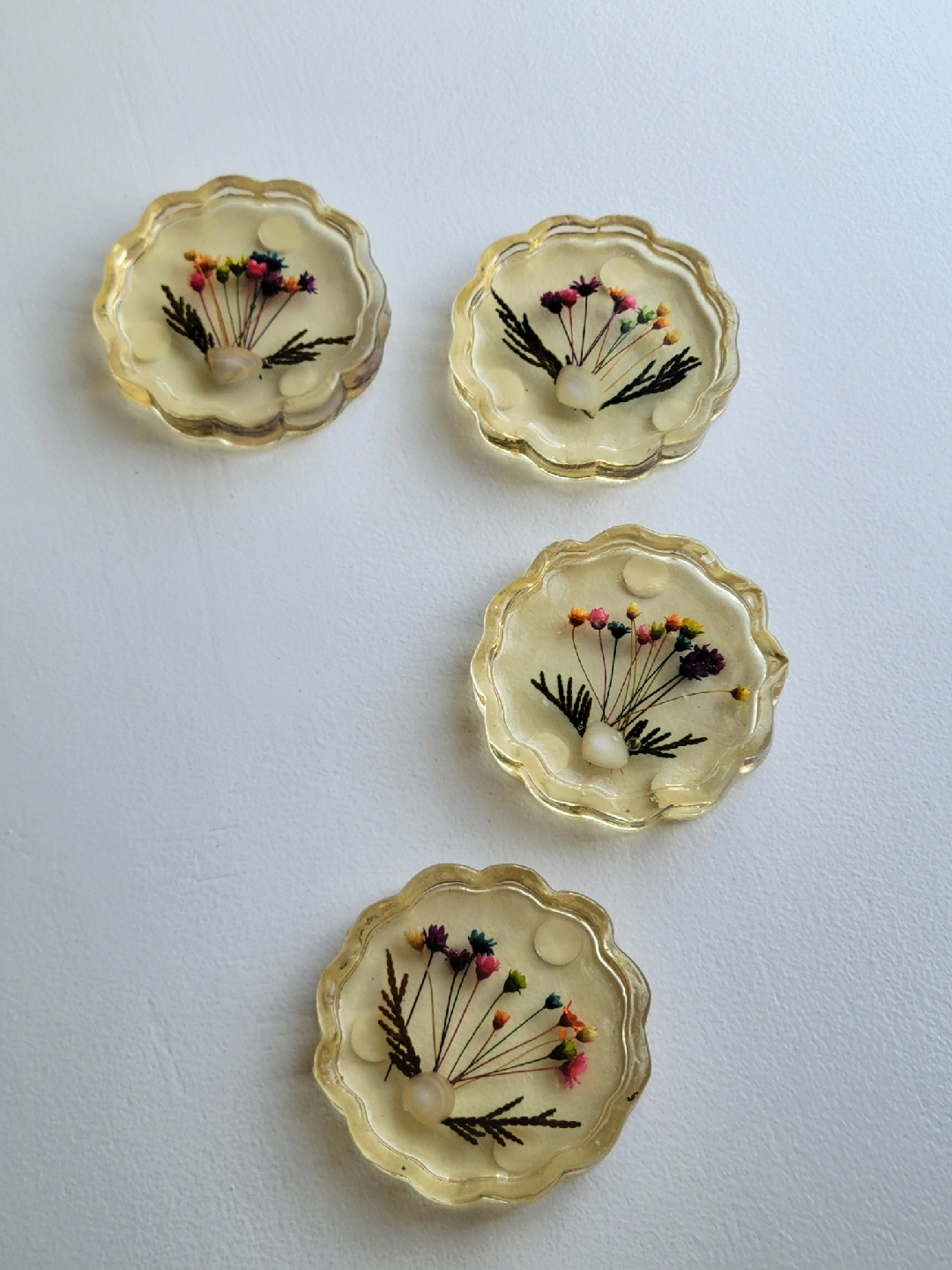 Add a touch of handmade charm to your space with these delightful, used resin coasters featuring real pressed flowers. Each coaster is unique, showcasing a beautiful arrangement of colourful blooms preserved in clear resin. These coasters are perfect for protecting your furniture while adding a whimsical, natural accent to your home decor. These are in used condition, and the resin has taken on a slightly yellowed hue. Here are some details: * Handmade with real pressed flowers/seashells * Made of resin * Set of 4 3-1/4" diameter Felt pads * $20/4 Cash, no shipping☆ Fennell and Upper gage Hamilton Please click on my many ads for sale