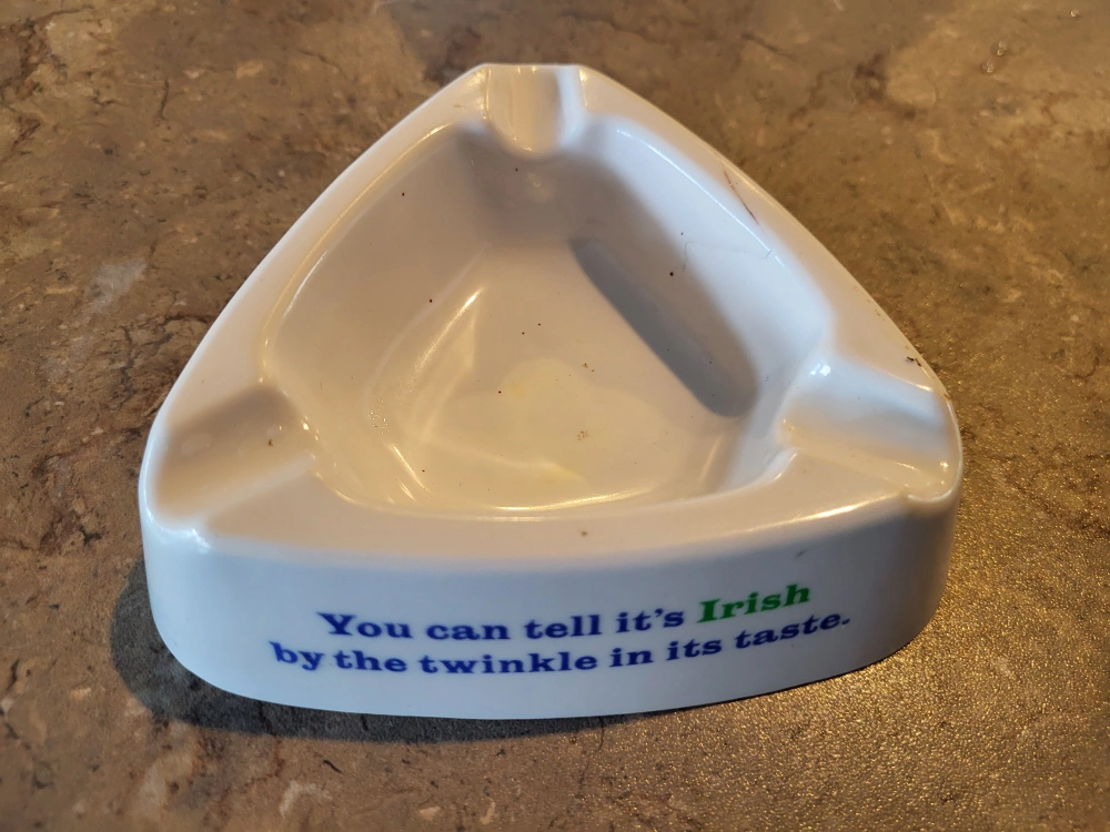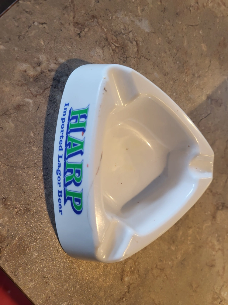 193Selling a vintage Harp Imported Lager tray. It's a unique piece with the Harp logo and the phrase 'You can tell it's Irish by the twinkle in its taste'. The bottom is marked 'Perma Color by CCS, Milwaukee, Wis.'