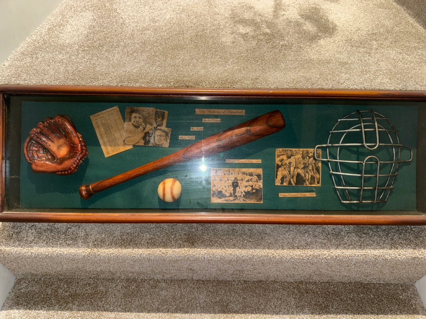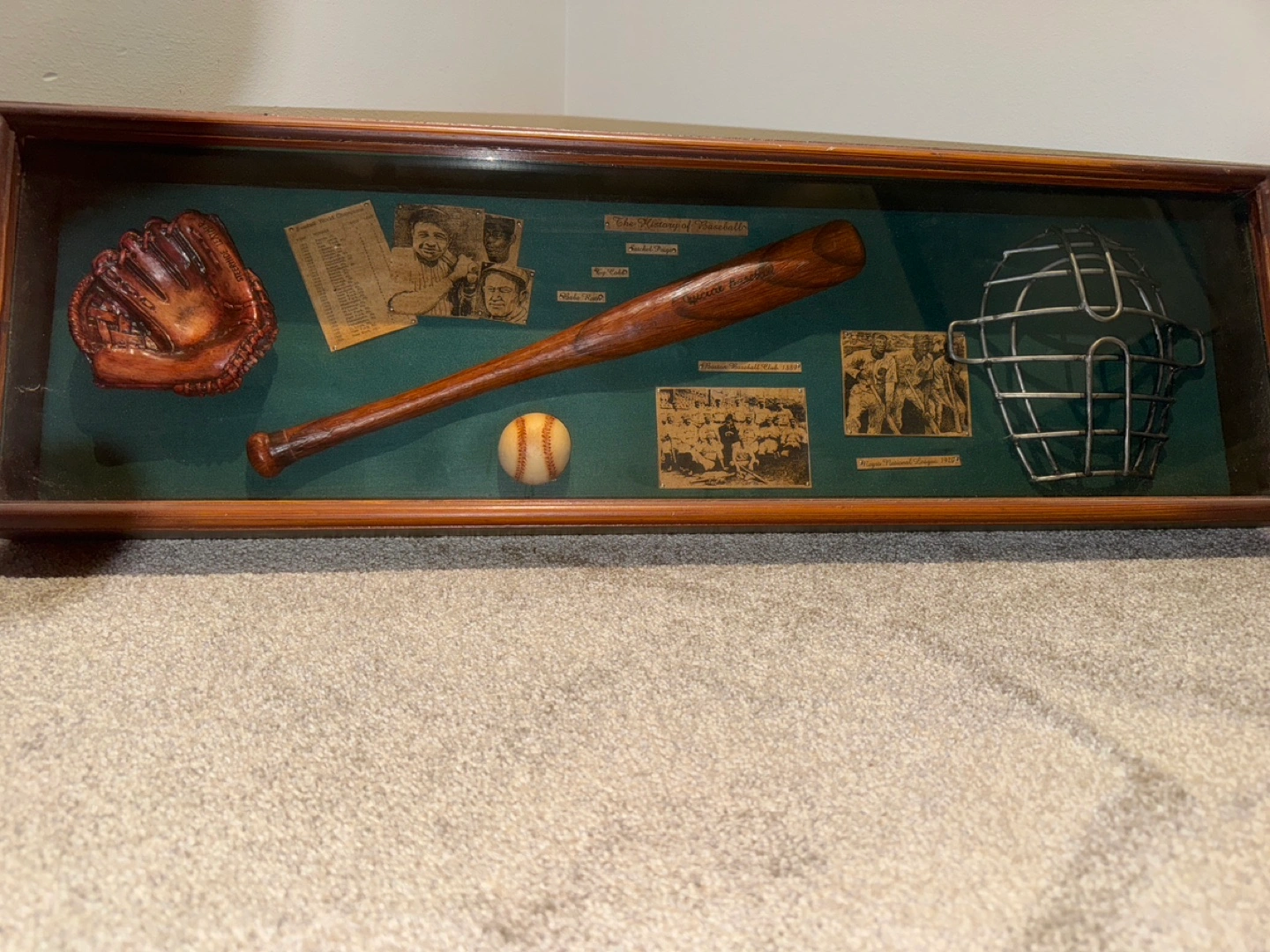 16Shadow box featuring Babe Ruth, Ty Cobb , Satchel Paige a baseball bat, ball, glove and mask
