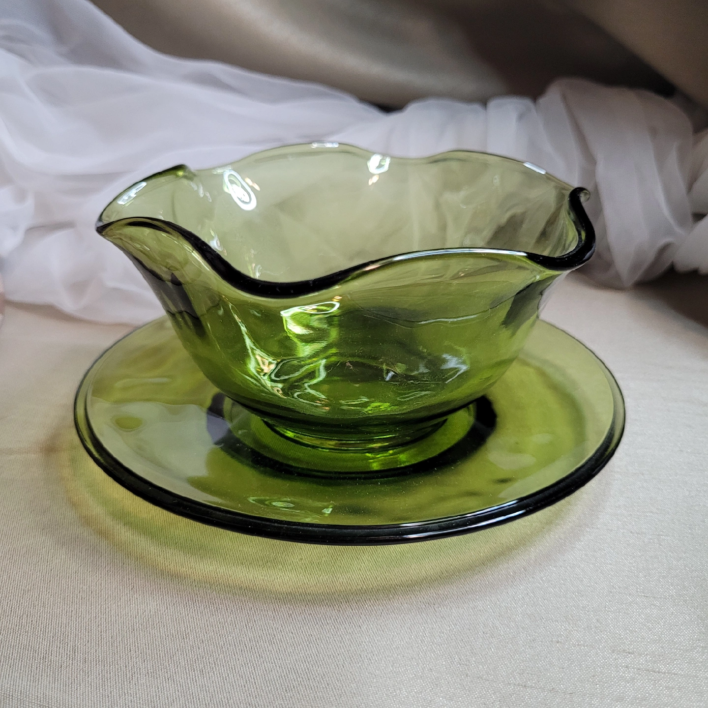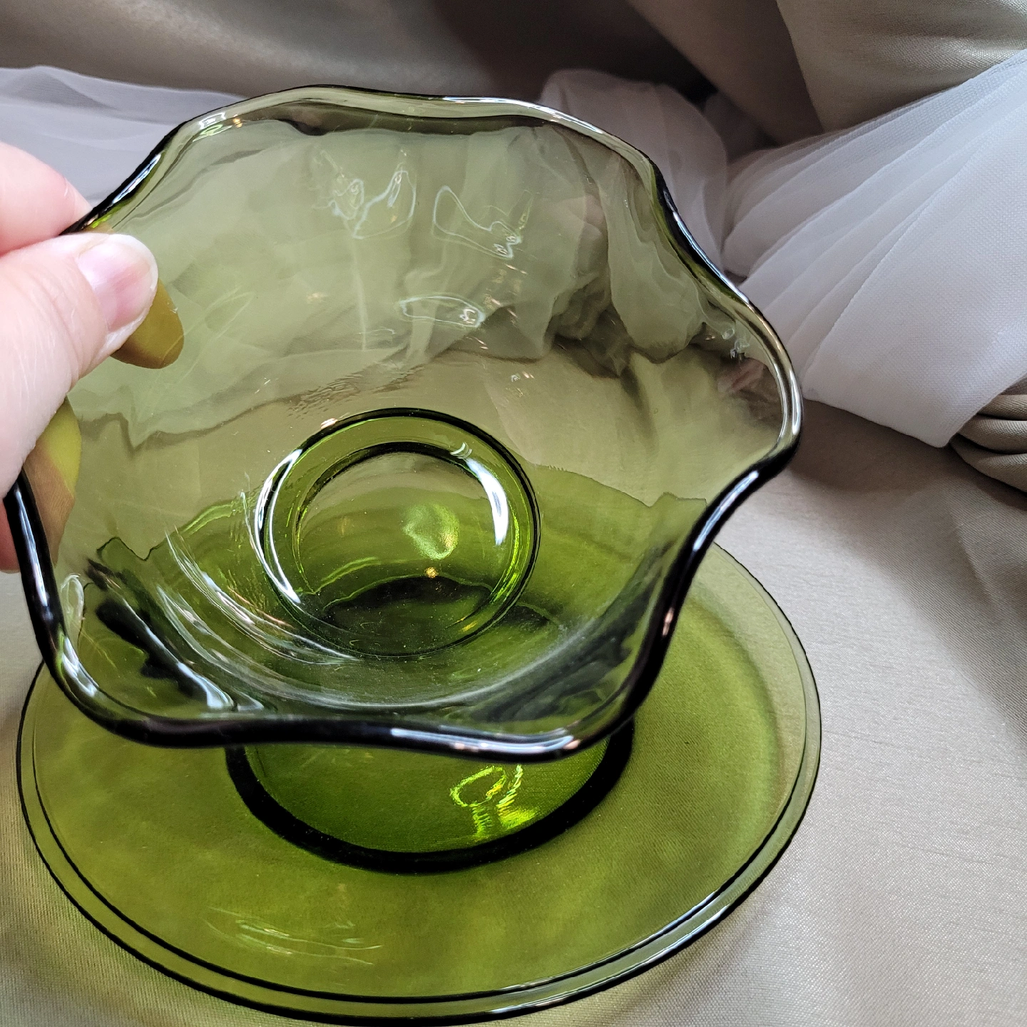 Show allVintage Indiana Glass Ruffled 2 pc Olive Green Set