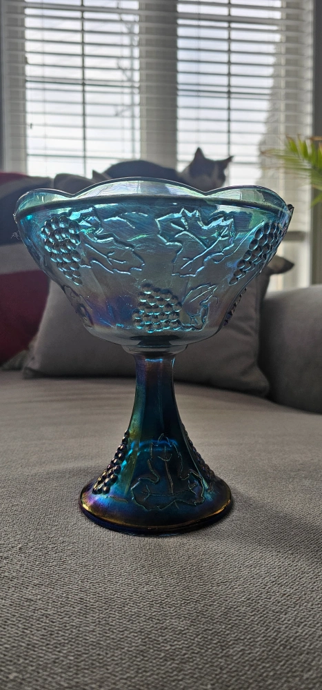75This Vintage set includes a candy pedestal bowl, two creamer/sugar bowls, and two matching serving trays. Iridescent blue colour with grape pattern. This three piece set of the creamer, sugar, and plate are valued at $30. There are two sets in this bundle. The Candy bowl is missing it's lid yet. With its lid it is valued at $50. I will list this also for $30. $90 for all Or Best Offer.