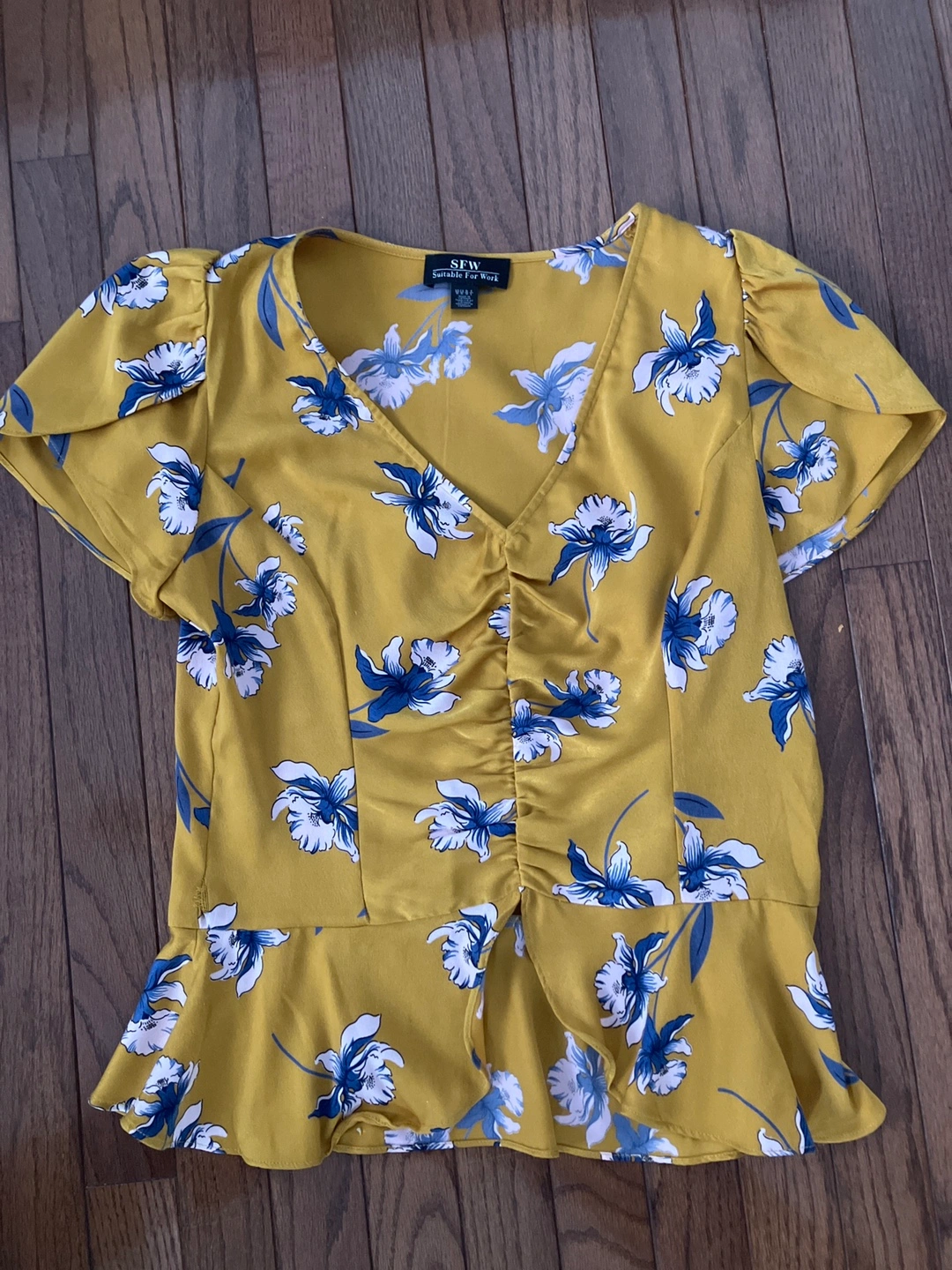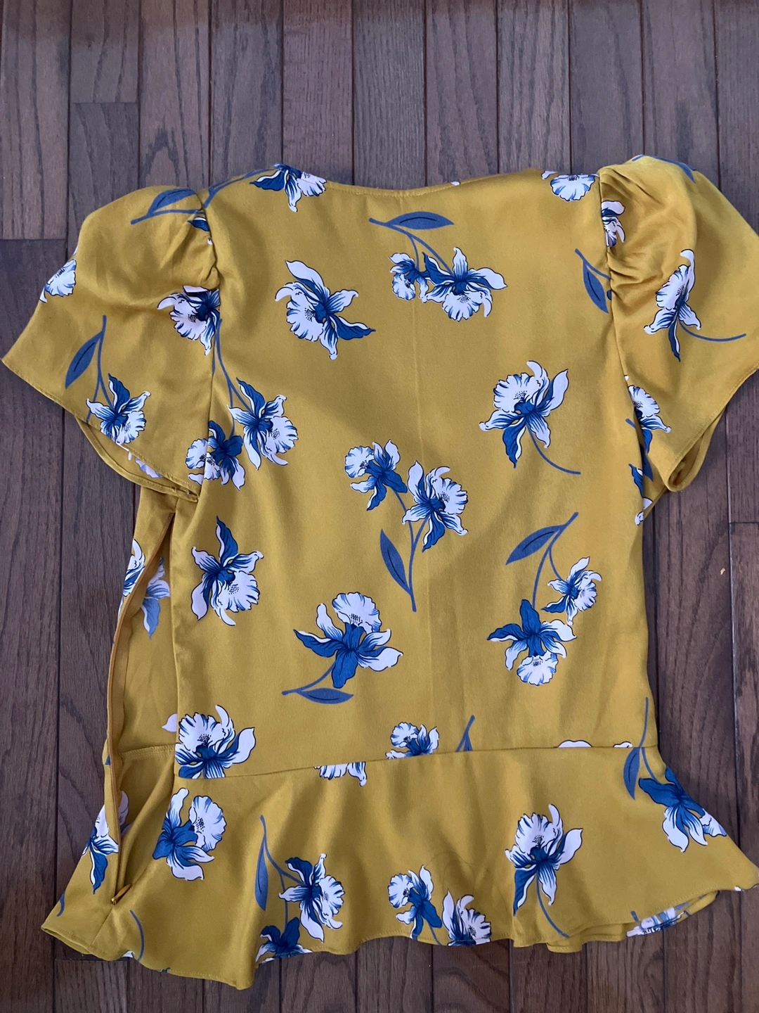 65This is a never worn cute mustard yellow floral blouse. Side zipper, soft and silky material.