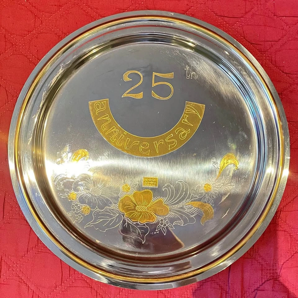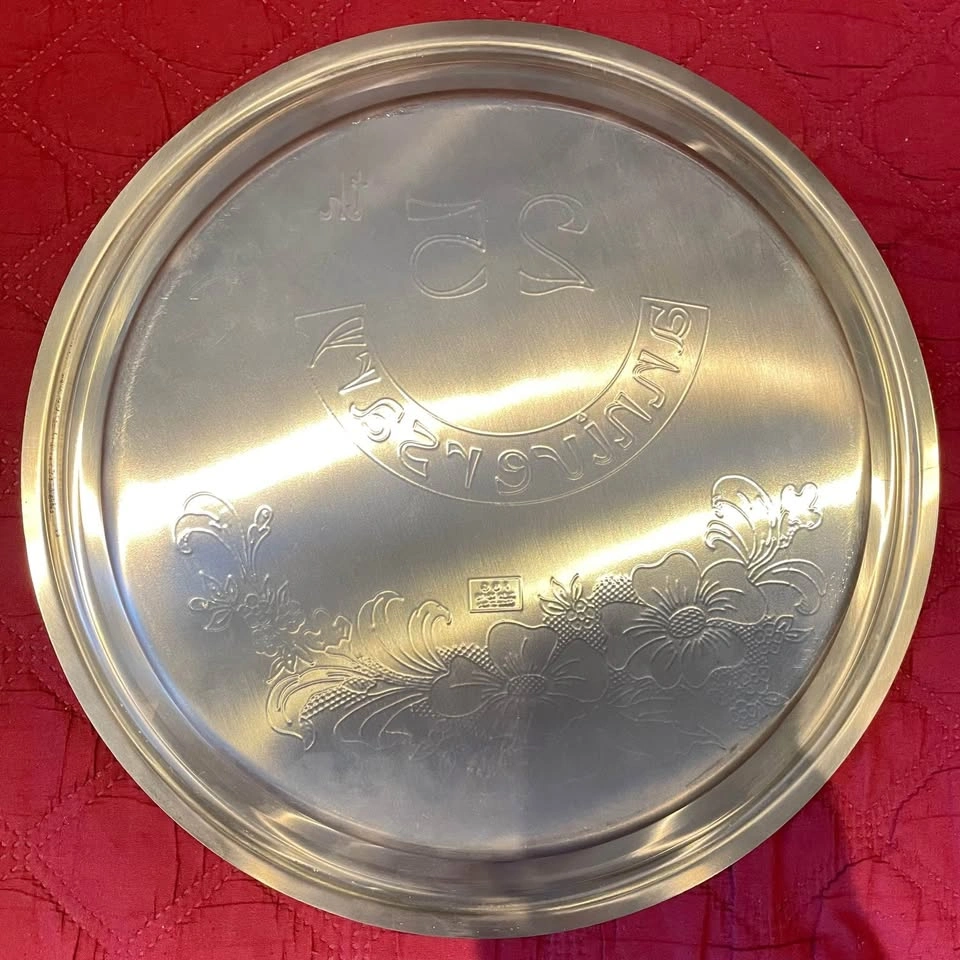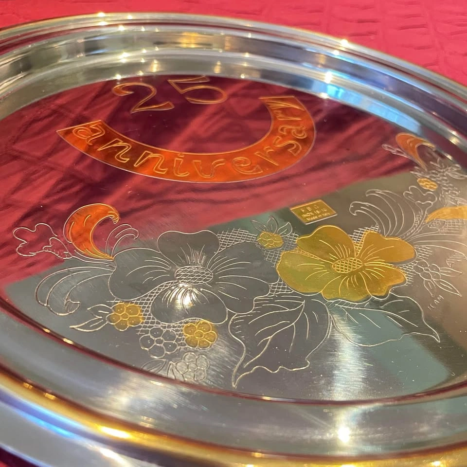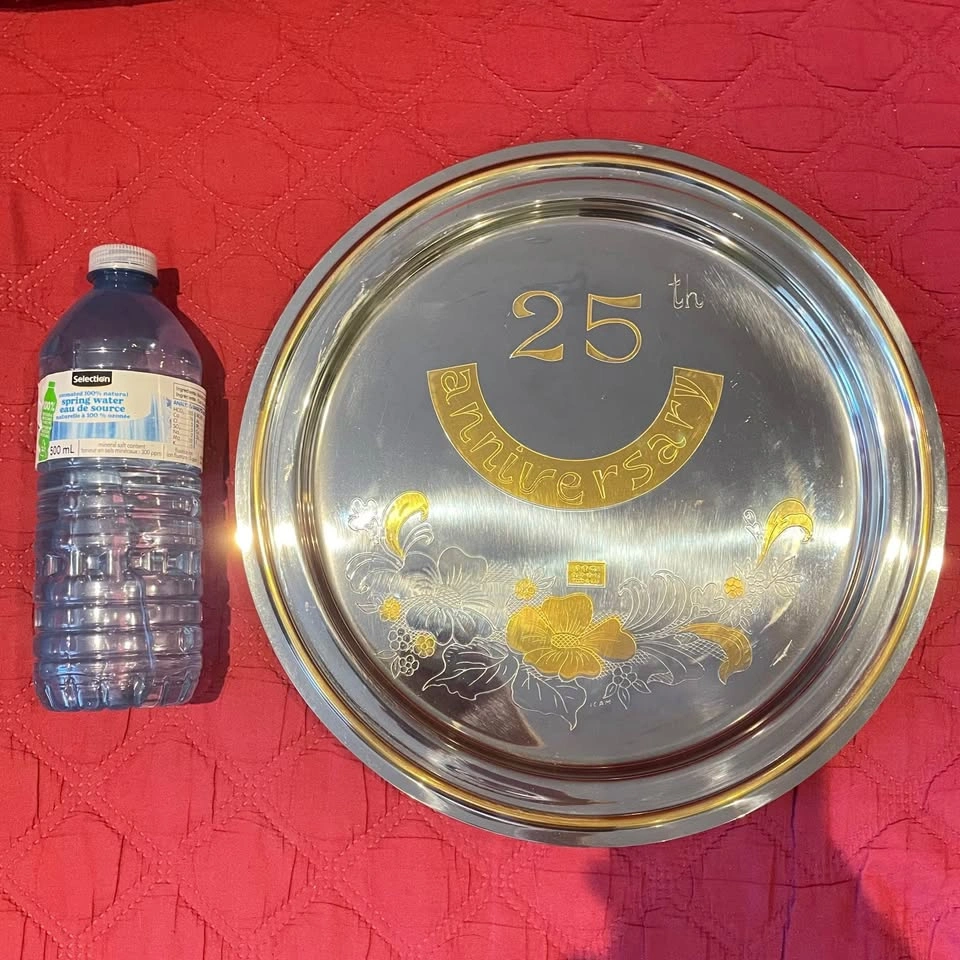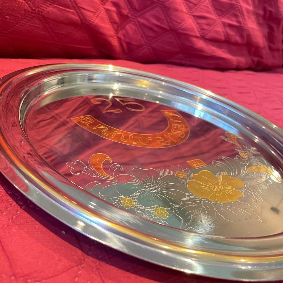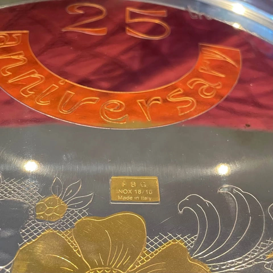 Pick up at Don Mils & Steeles Vintage Italian Freddi Inox 18/10 stainless steel round serving tray featuring a 25th Anniversary Special Edition design. Mirror-polished finish with elegant silver and 24k gold (“oro”) floral accents. Perfect for serving drinks, desserts, or as a decorative piece. Condition: Excellent vintage condition Dimensions: 12” (31 cm) diameter Brand: Freddi (FBG) -Made in Italy What is 18/10 Stainless Steel? Made from premium stainless steel containing 18% chromium and 10% nickel. This composition provides excellent resistance to rust, stains, and corrosion while maintaining a bright, polished finish. 18/10 stainless steel is widely used in professional kitchens and high-quality tableware. *Water bottle shown for scale only — not included. Check out my profile for the other 3 vintage stainless steel trays!