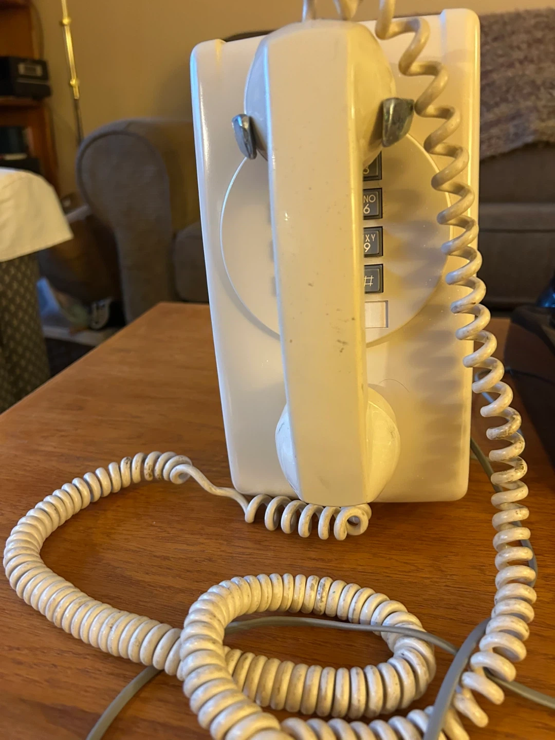 60Selling a vintage ivory-coloured wall mount telephone. It's in good condition for its age and would be a great addition to a retro-themed space or collection
