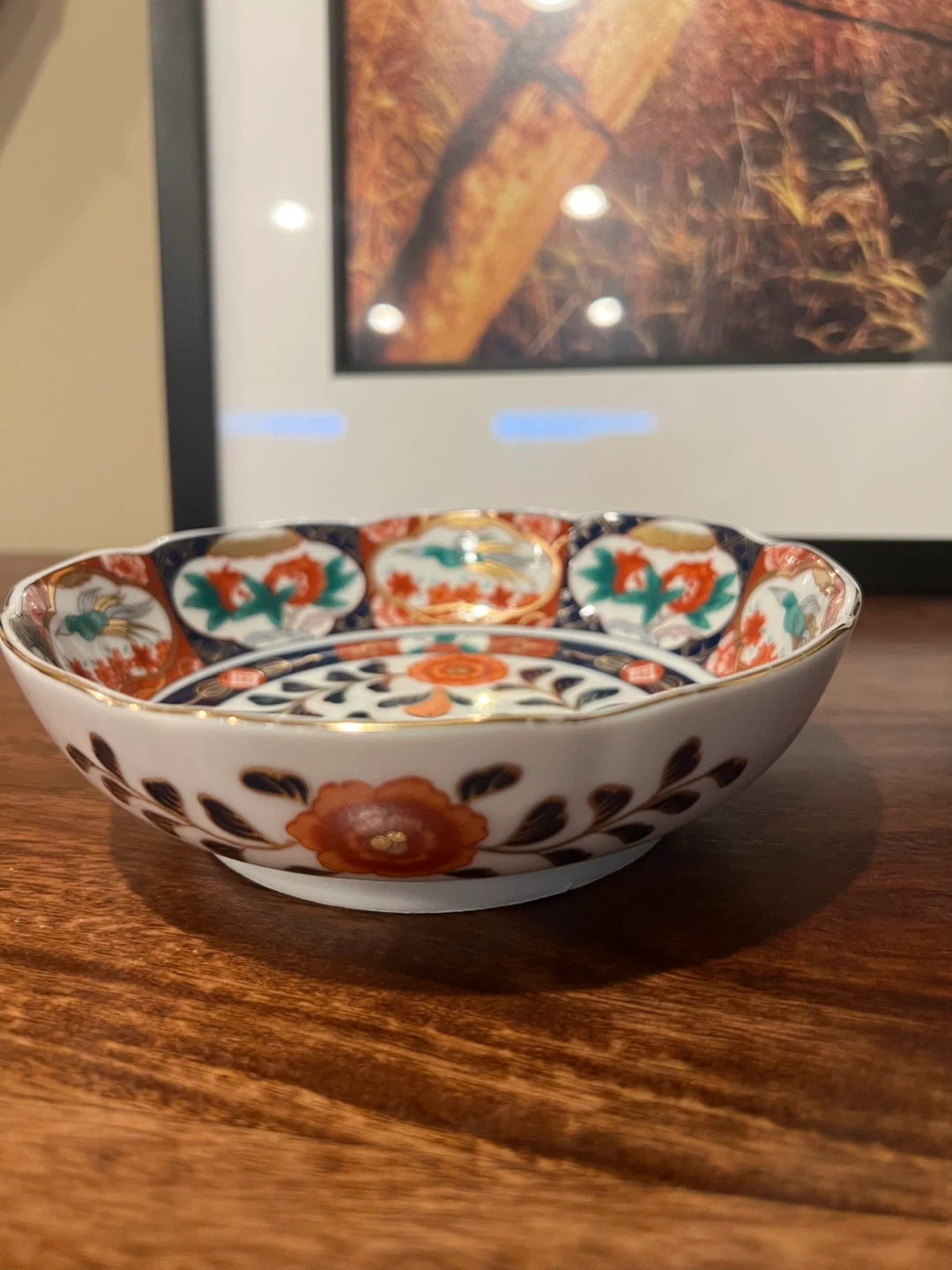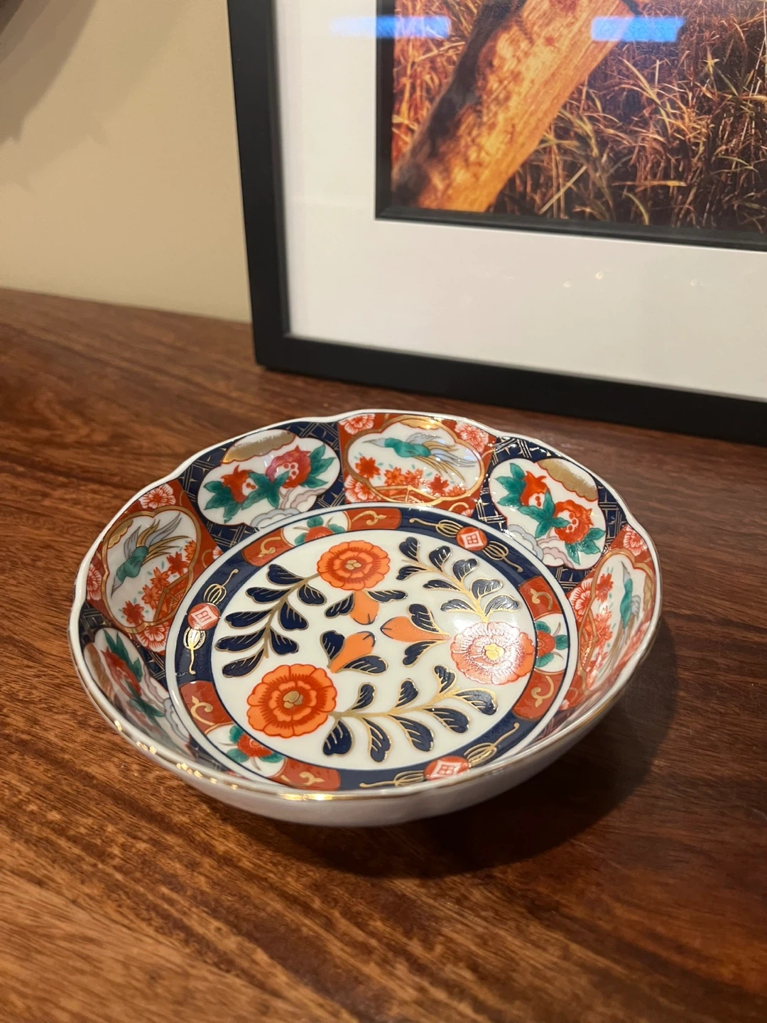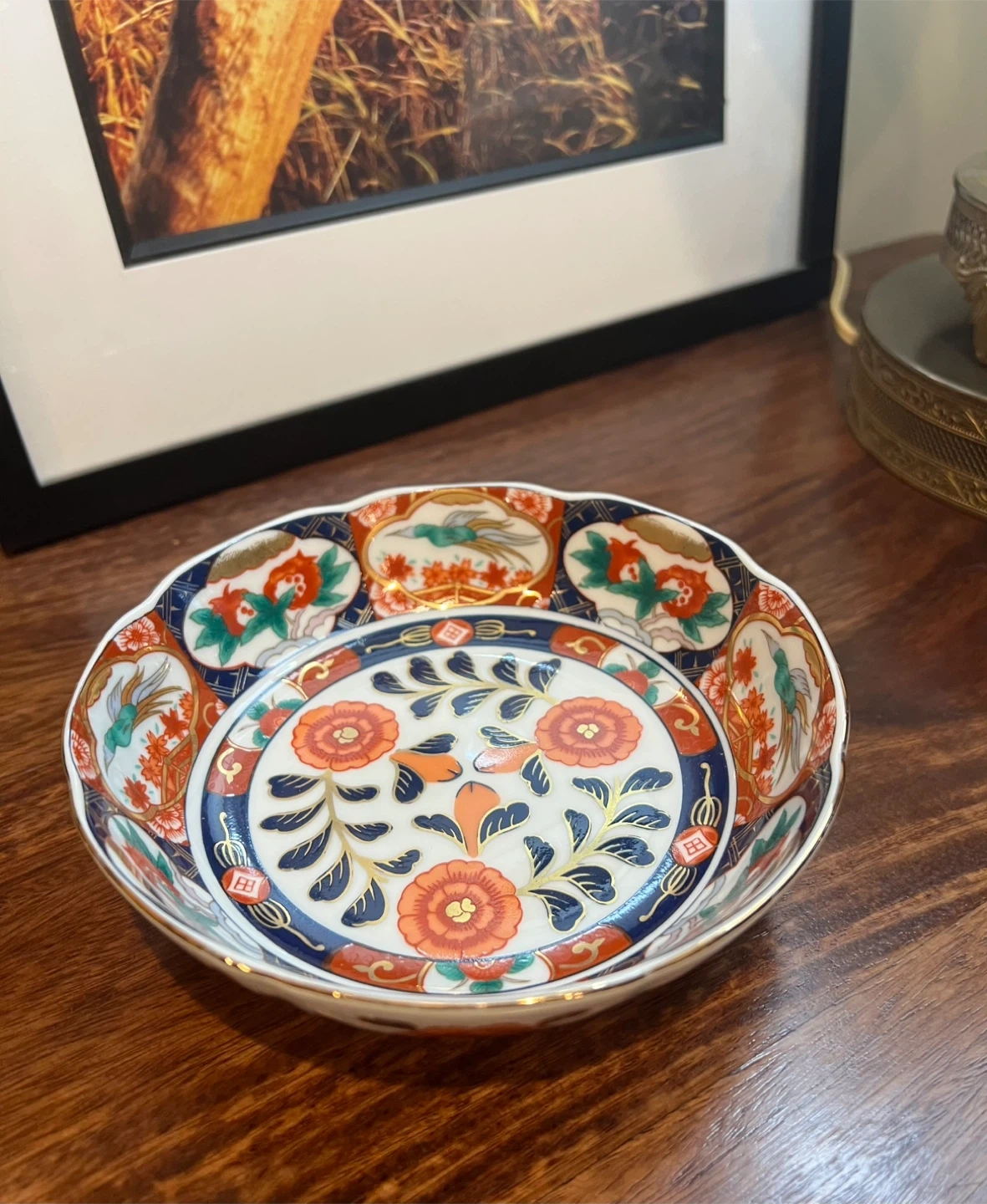 579Lovely floral design in orange, blue, and gold accent Vibrant colours Scalloped edges Japanese art Excellent condition 6” across and 1.75” tall Asking $25 Interested? Message me and please check my other listings…