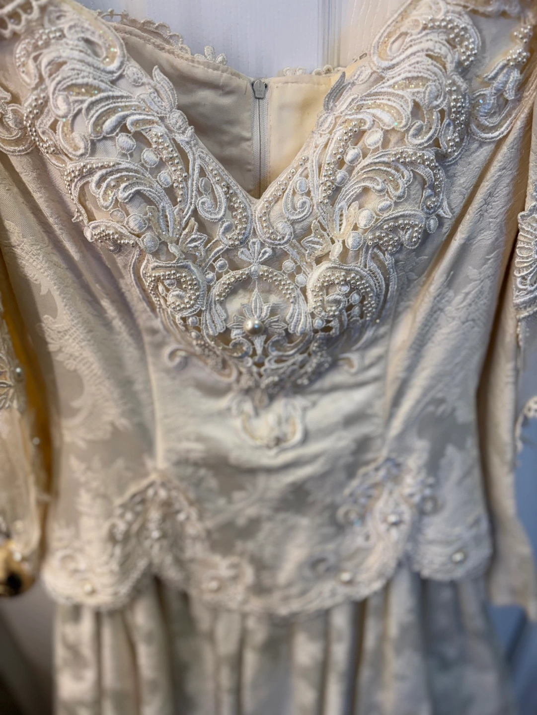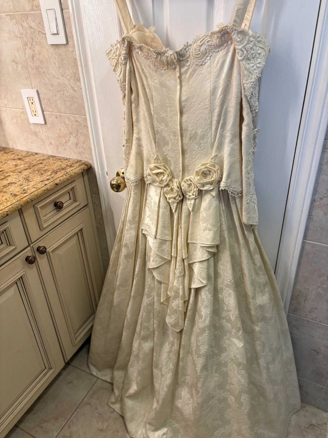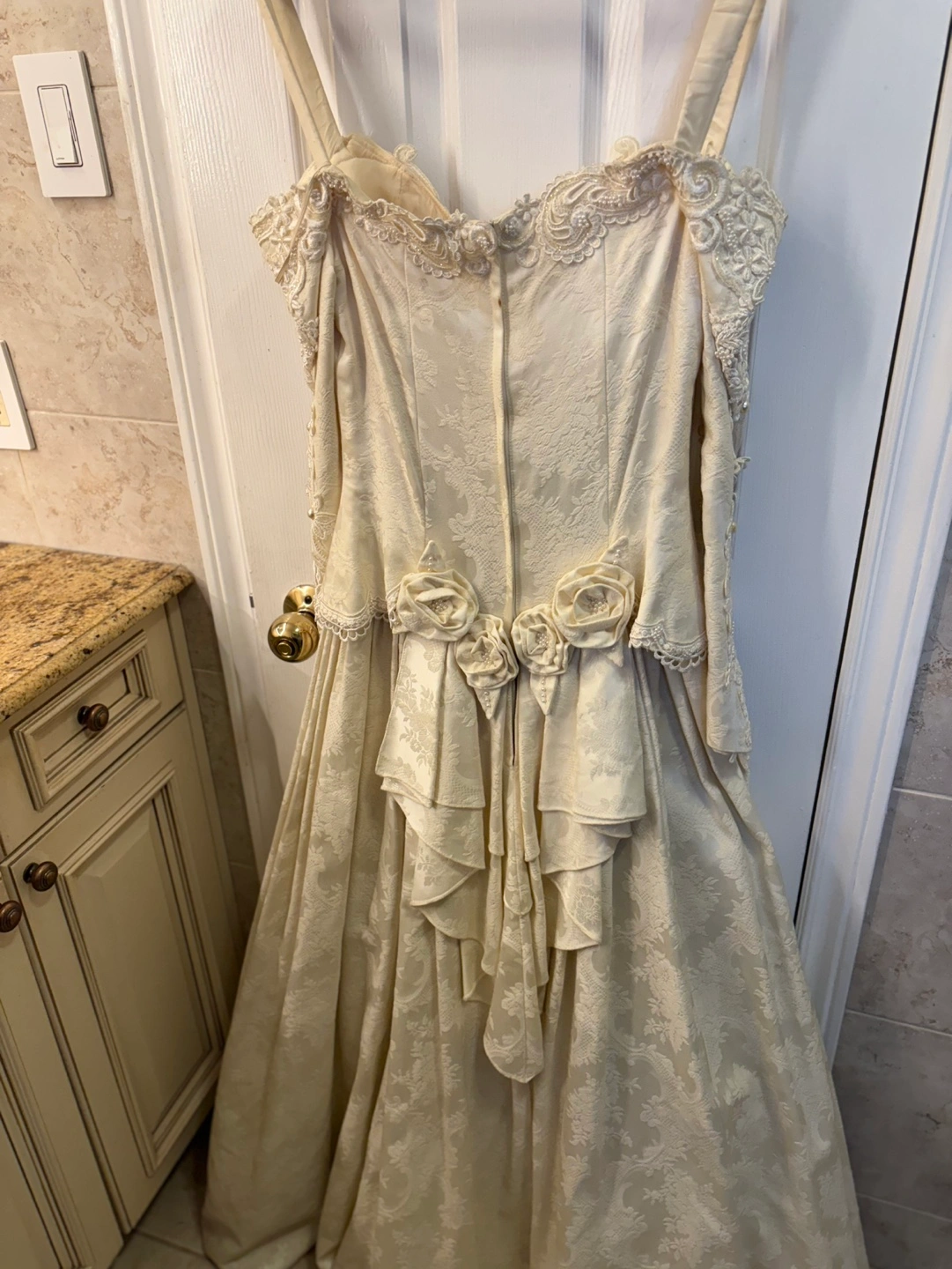 Off-the-shoulder, long-sleeved wedding dress. Beaded lace bodice. A-line skirt. Back features a bustle and fabric rose accents. Made in the U.S.A. Selling as is