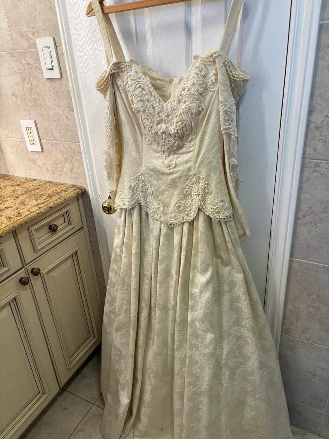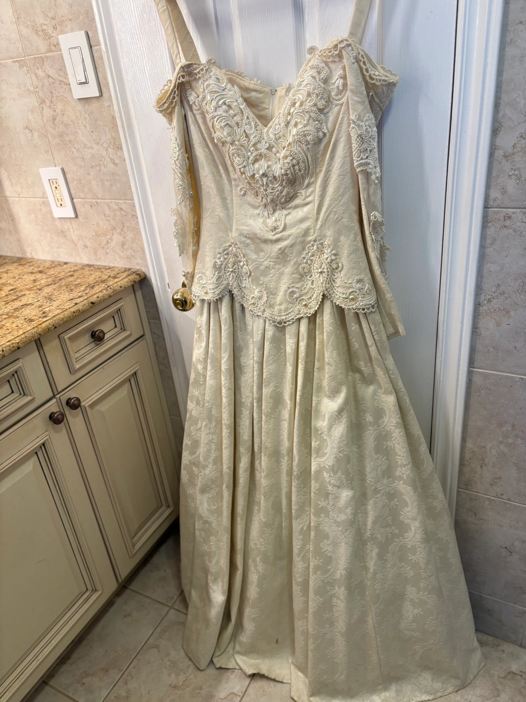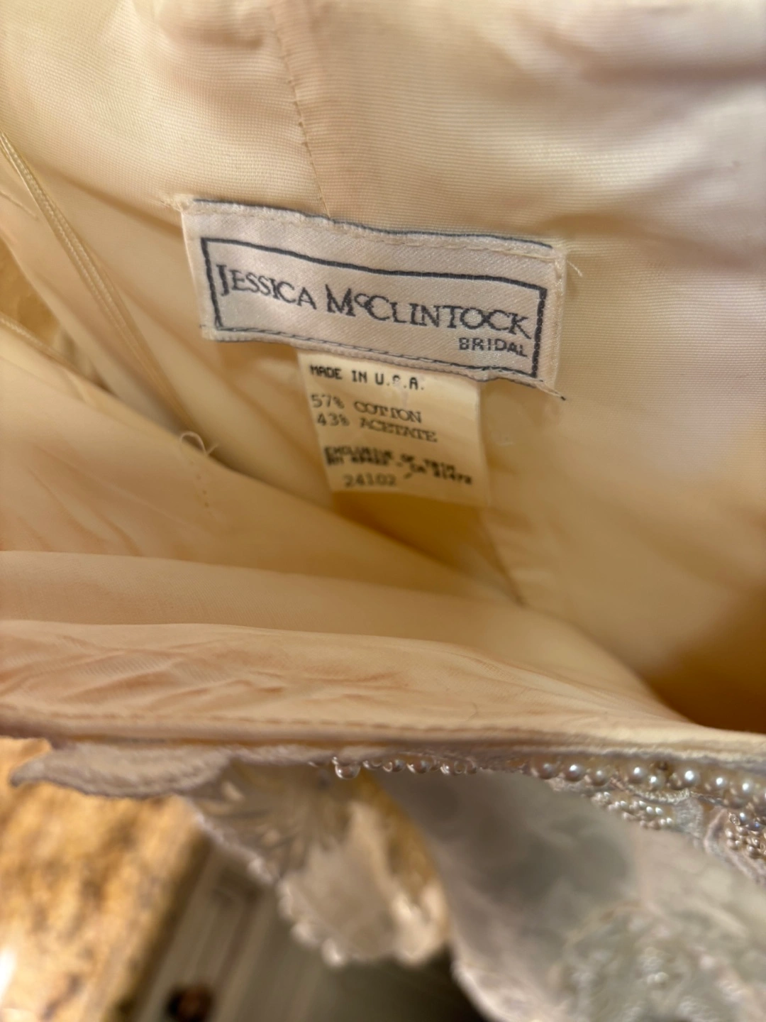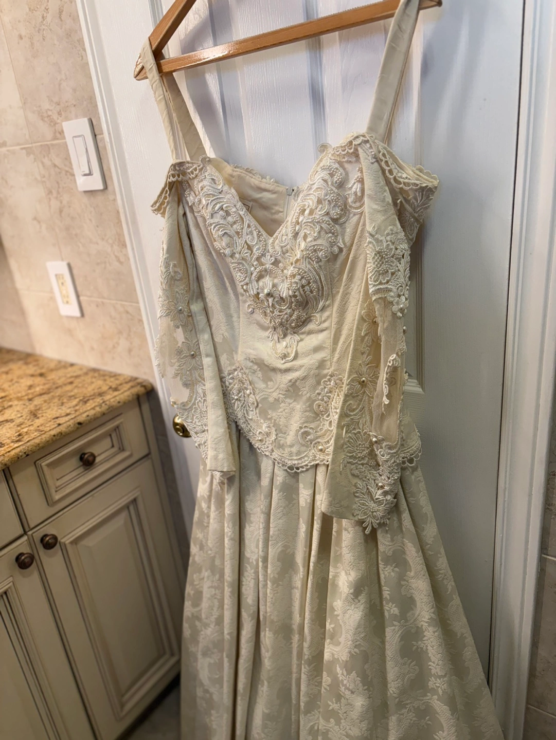 Off-the-shoulder, long-sleeved wedding dress. Beaded lace bodice. A-line skirt. Back features a bustle and fabric rose accents. Made in the U.S.A. Selling as is