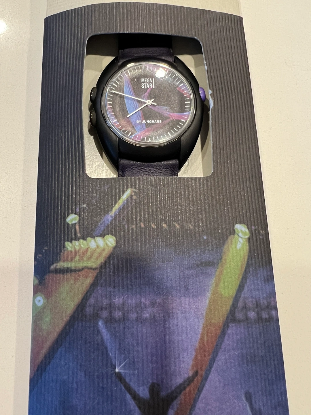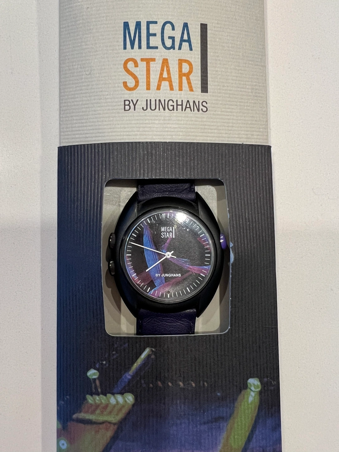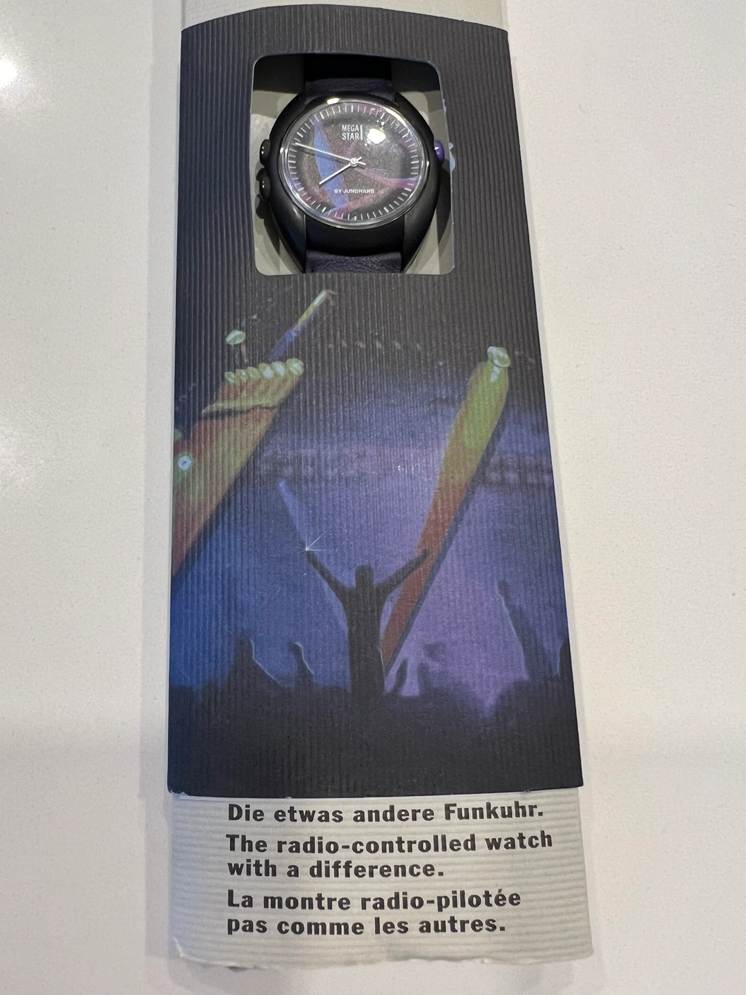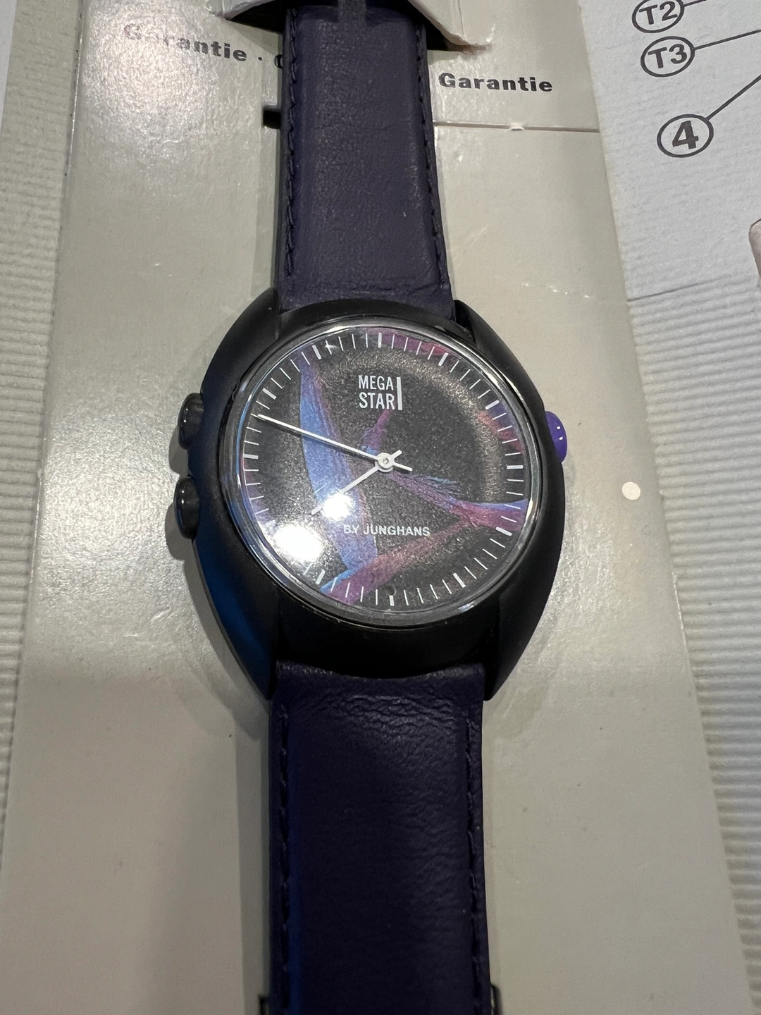 Radio-controlled wrist watch with purple band. Purple leather band Watch by Junghans Germany New but requires new battery