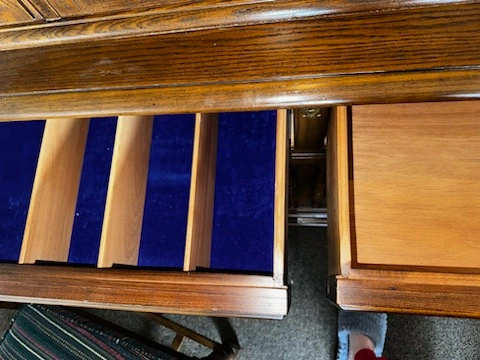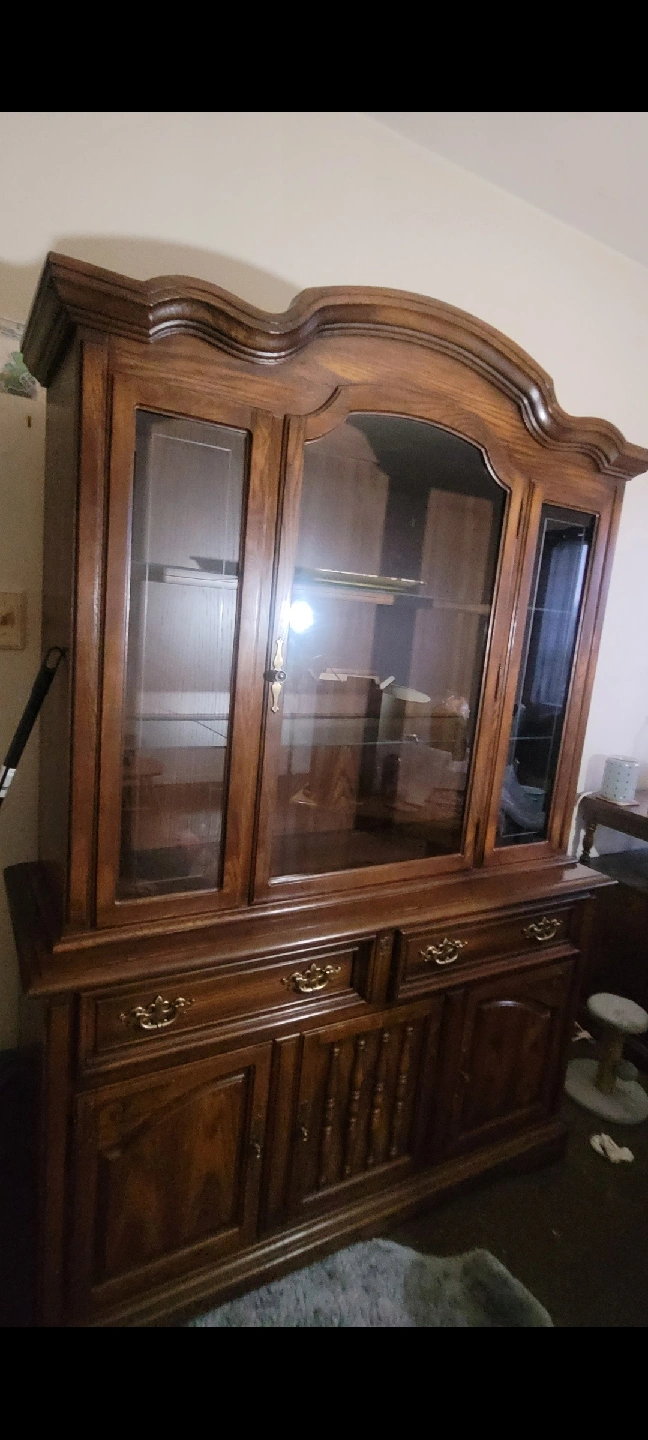 70Selling a beautiful vintage hutch by KATCHEL Quality Furniture. It features lovely wood detailing, glass-fronted cabinets with an internal light and drawers with blue velvet lining. A great piece to add some classic charm to your home!