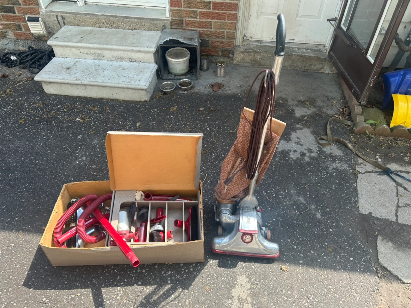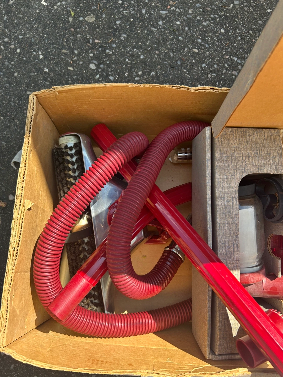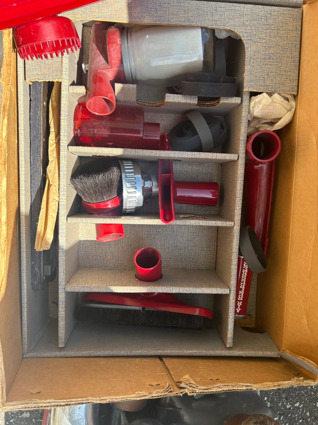 Vintage Kirby vacuum cleaner. Includes original box and various attachments. Red and silver colour scheme. Shows some wear consistent with age. used only 3 times open for offers