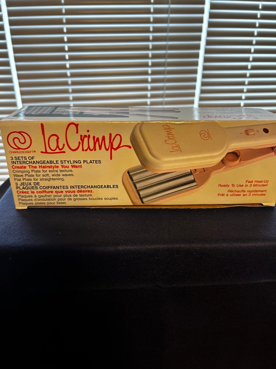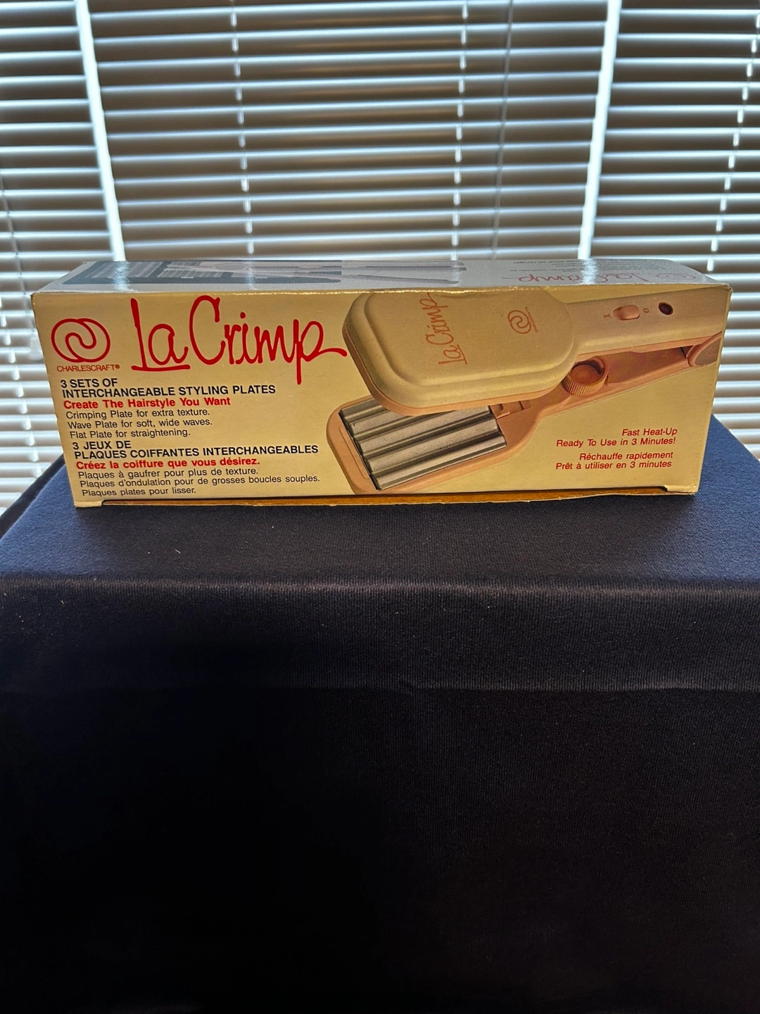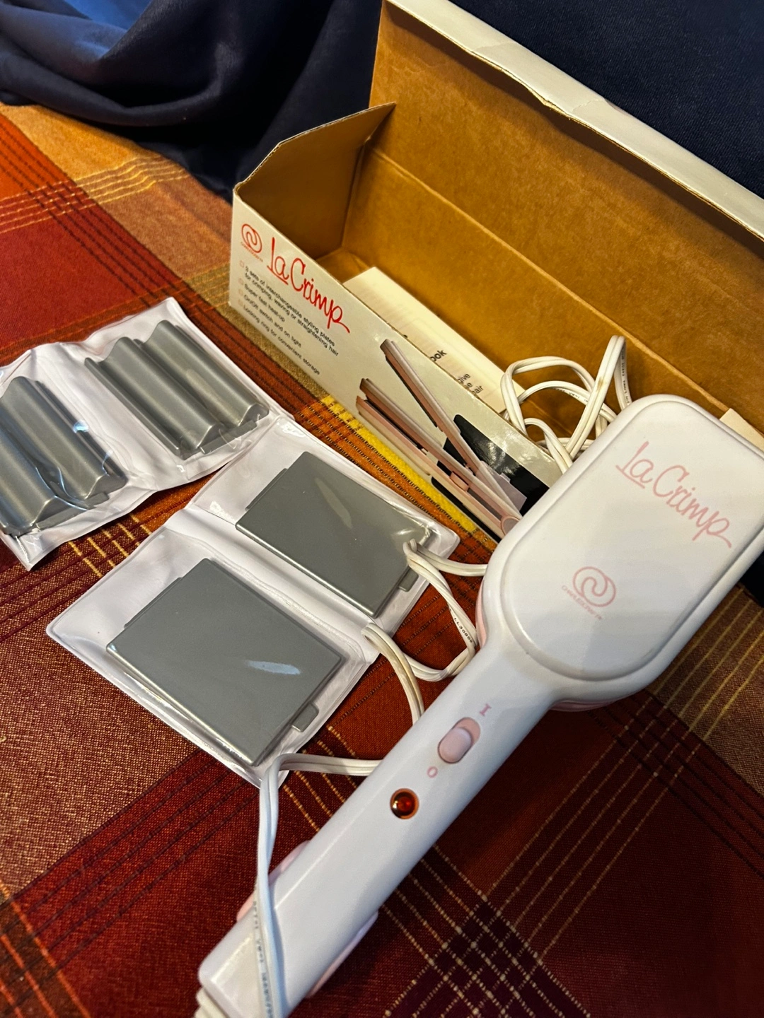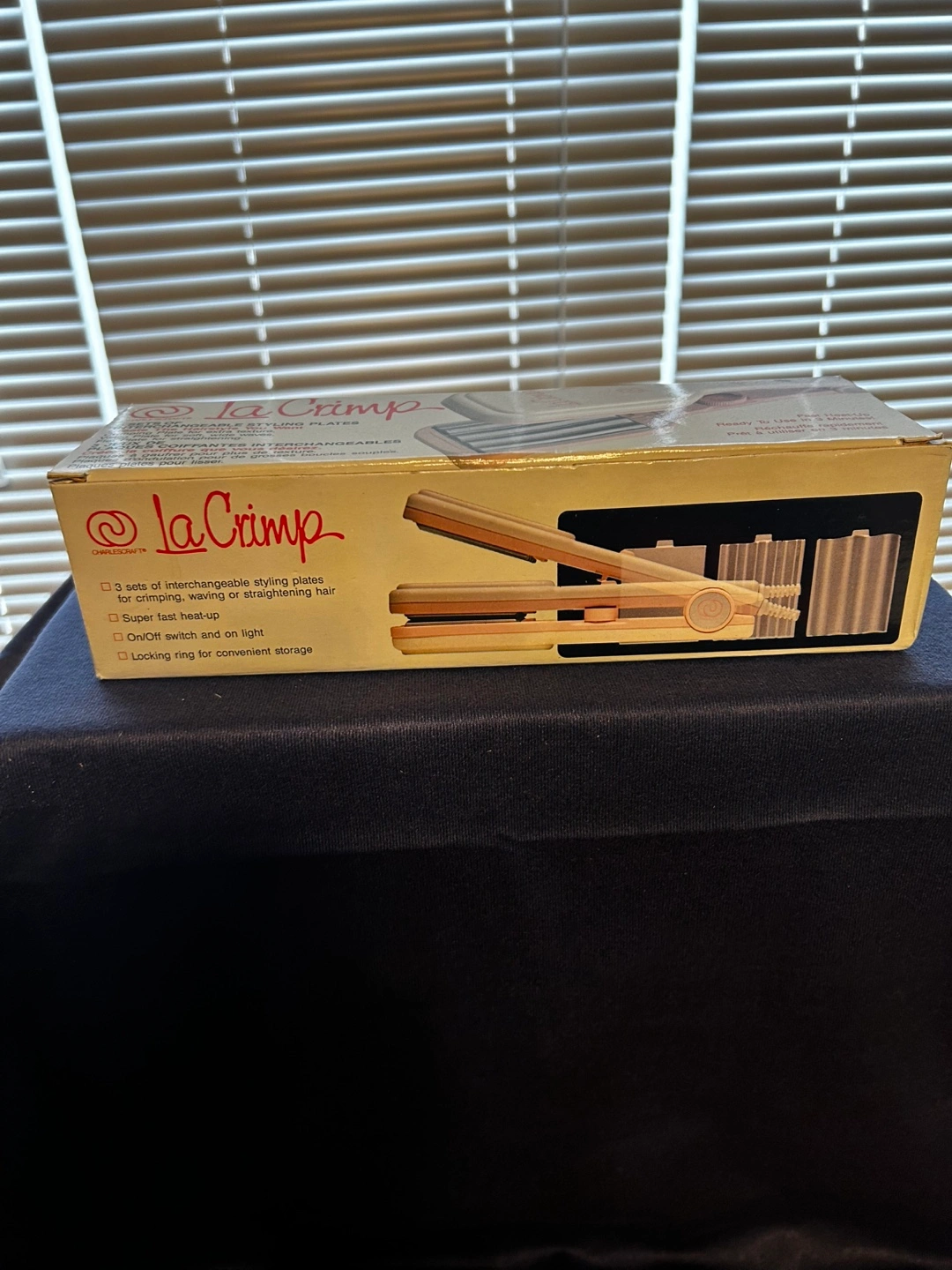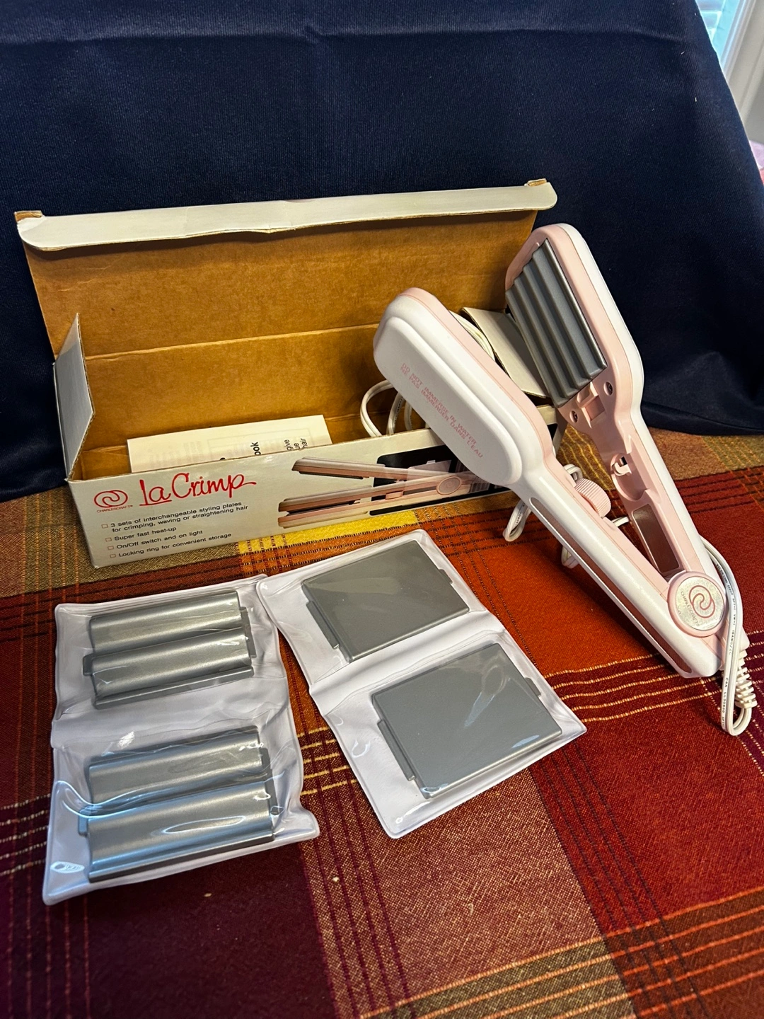 74Vintage hair styling iron. Three sets of interchangeable plates. Includes original box and instructions. Great for crimping, waving, or straightening hair. Super fast heat-up.