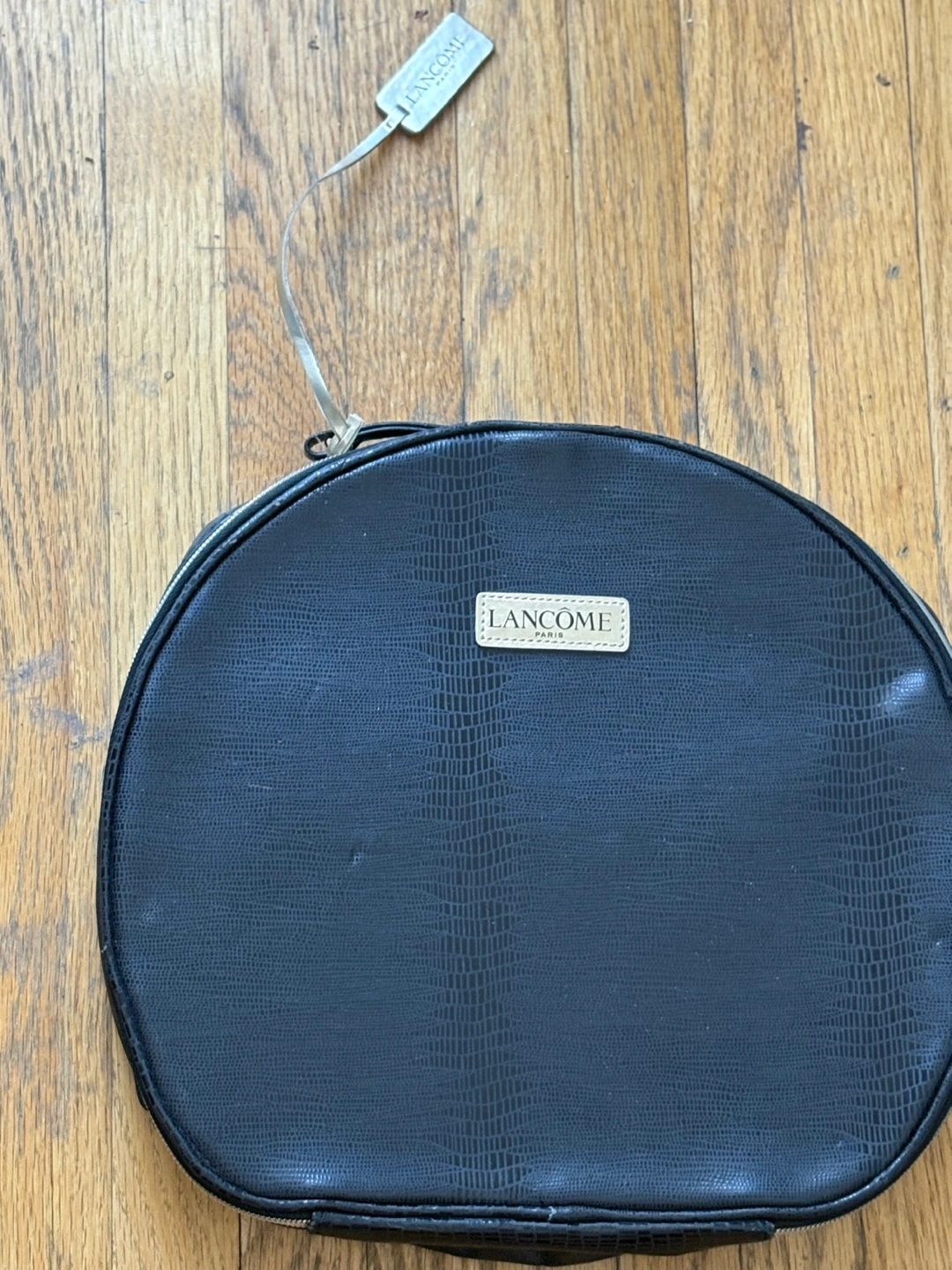 Black cosmetic bag. Zipper closure. Snakeskin pattern. Small carrying strap. Excellent for travel.