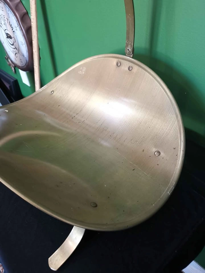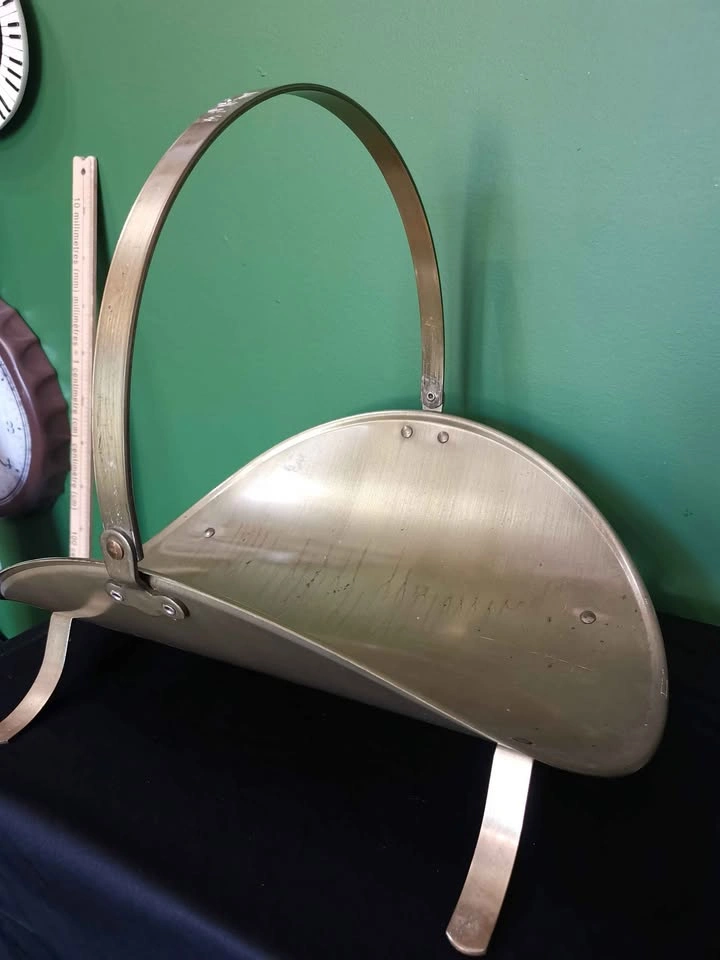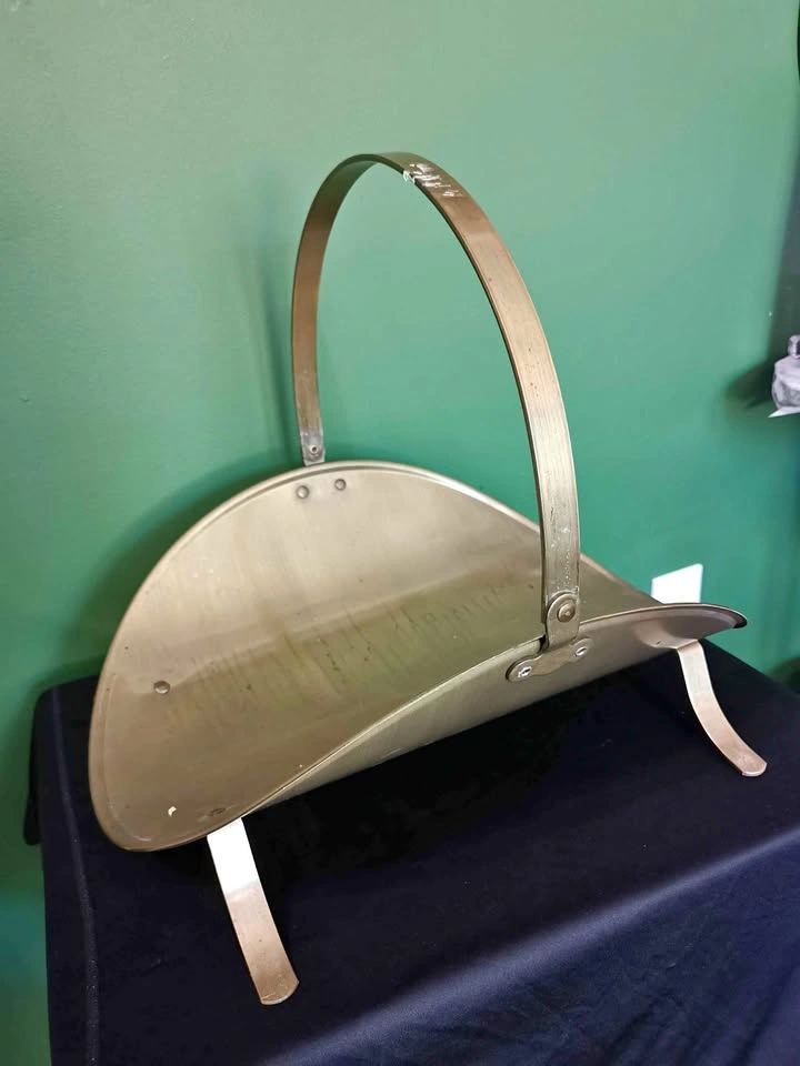 10Vintage metal curved fireplace wood holder with a top handle. With some wear scratches/rust spots