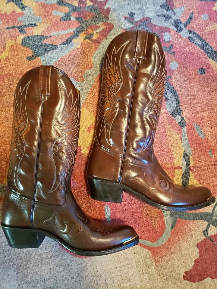 25Absolutely gorgeous pair of Canada West cowboy boots made in Winnipeg, Manitoba. Purchased in Vancouver in 1987. Rich brown leather with wing embroidery and brass toe guard detail. Condition is excellent for their age — uppers are glossy with very minimal scuffs; soles show light wear. Inside leather has natural browning from age. Stored in box. Smoke free home. Box and paperwork show wear and tear consistent with age. Measurements: • Inside length (heel to toe): 11.5" • Width at ball: 4" • Heel height: 2" • Shaft height: 13" Approx. fits men’s size 10 to 11 (please confirm fit by measurements). Includes the original box and partial bill of sale from 1987 (Paid $165 March 19, 1987 Florsheim Shoe Shop). These are museum-worthy vintage western boots — rare to find in this condition. Made in Canada, all leather, ready to wear or display. Cross posted. Pick up in North Van.