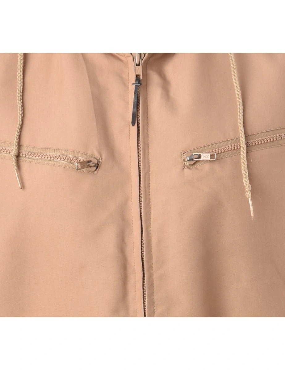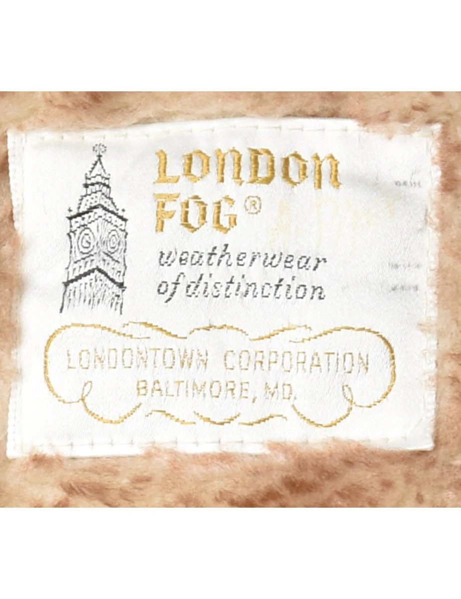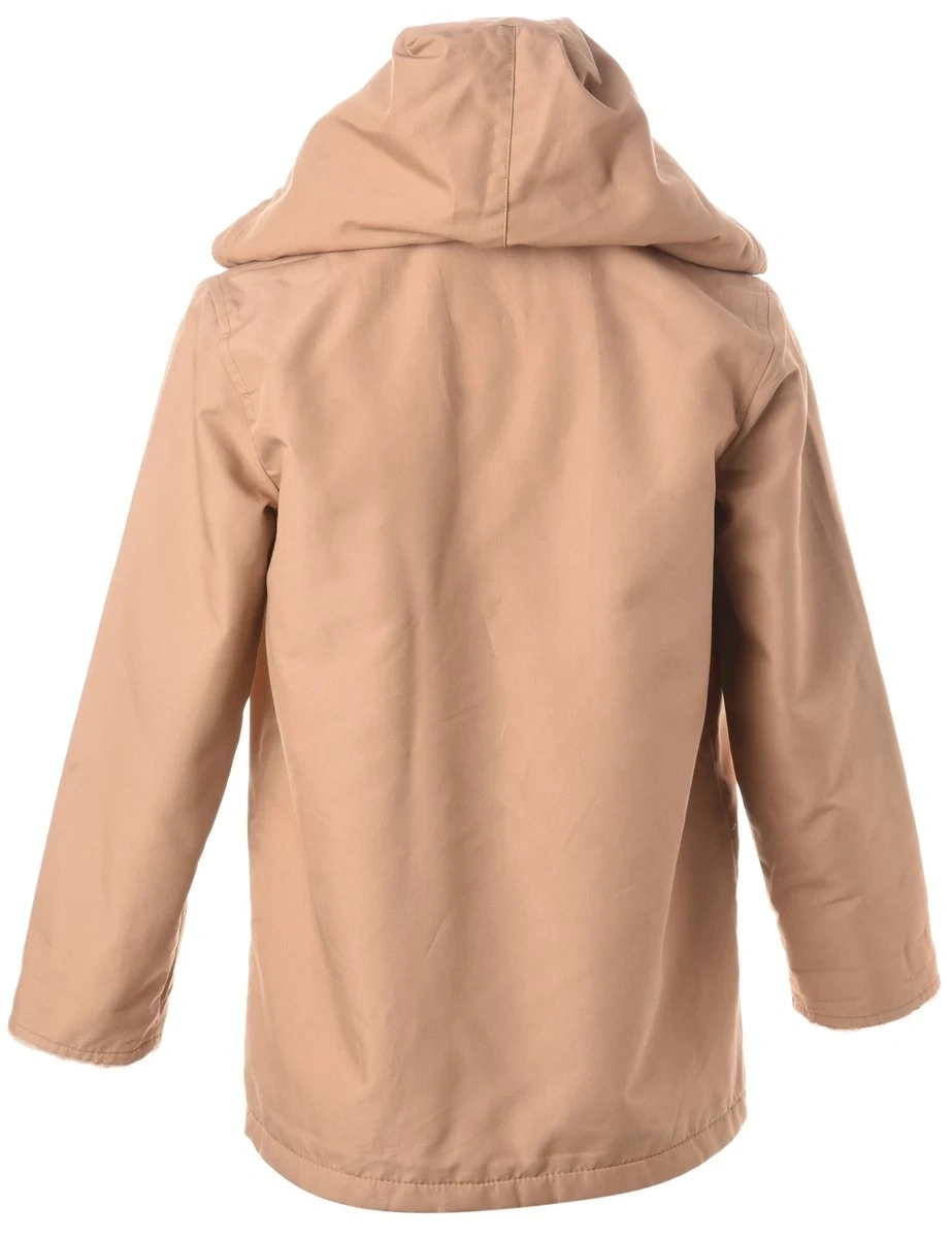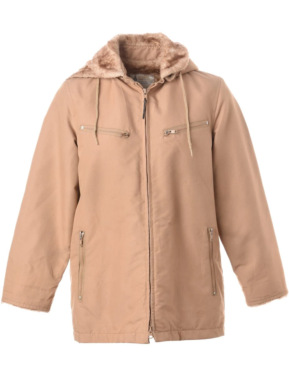 01980s hooded jacket by London Fog. Size 11/12/M Light brown/tan with faux fur lining, 4 pockets and detachable hood. Very warm for Canadian winters. Bottom right pocket has a hole inside the pocket. Not visible from the outside.