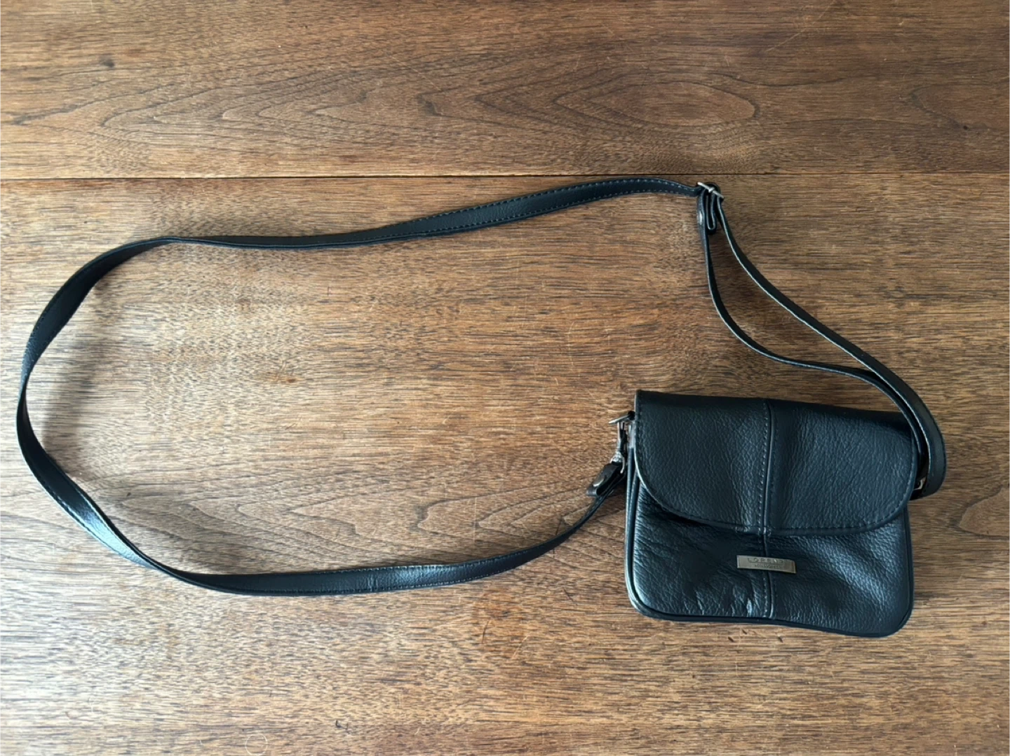 69Here's a stylish vintage black leather mini crossbody bag from Lorenz Accessories! It's perfect for everyday use and can easily hold your essentials. The adjustable strap makes it comfortable to wear, and the classic design will complement any outfit. Cash only.