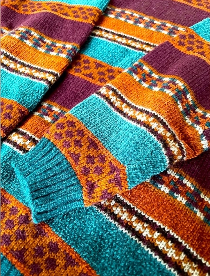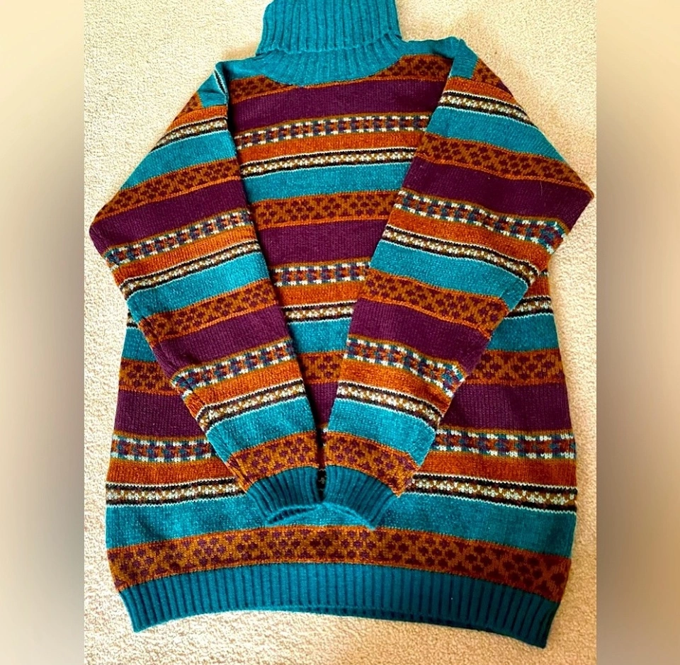 521This is a colourful long-sleeved turtleneck sweater with a bold striped pattern. It is made of 100% acrylic and features a ribbed collar and cuffs. Soft!! Excellent condition.