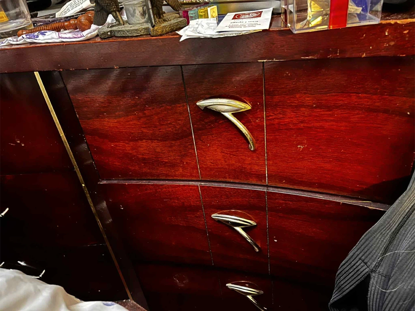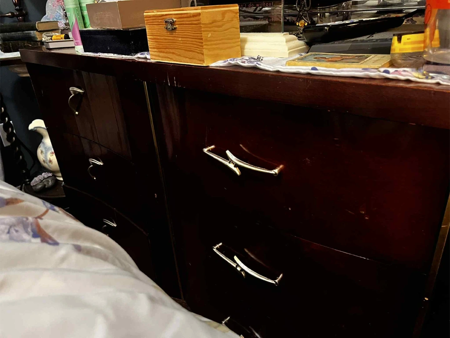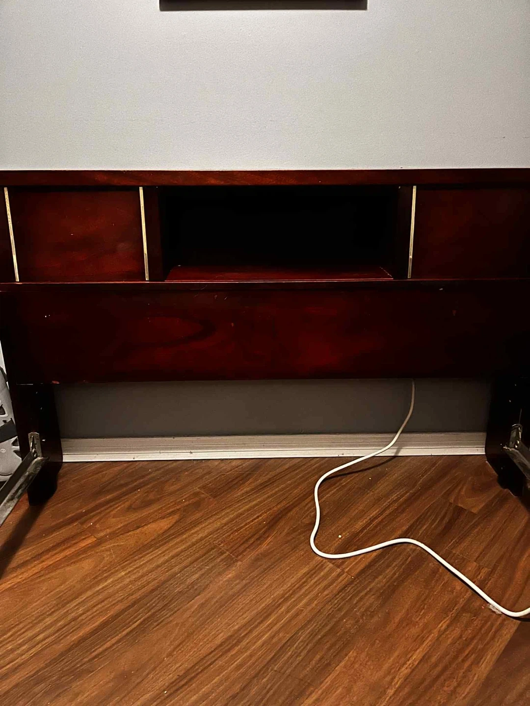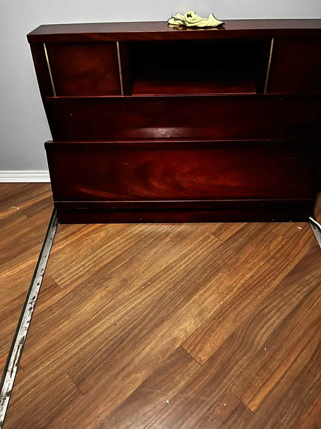 10Selling a lovely vintage dresser and headboard set. The dresser has a beautiful mahogany finish and unique hardware. The headboard also features a mahogany finish with built-in shelving. Great for adding a touch of classic style to your bedroom!