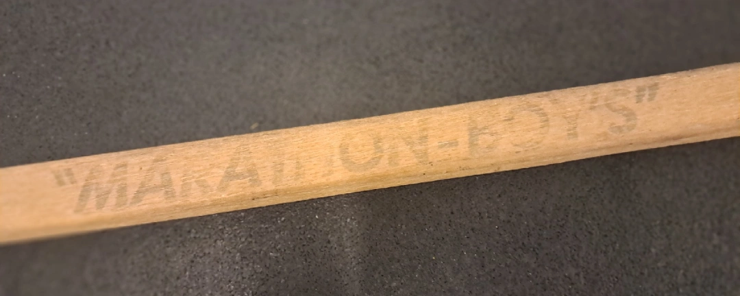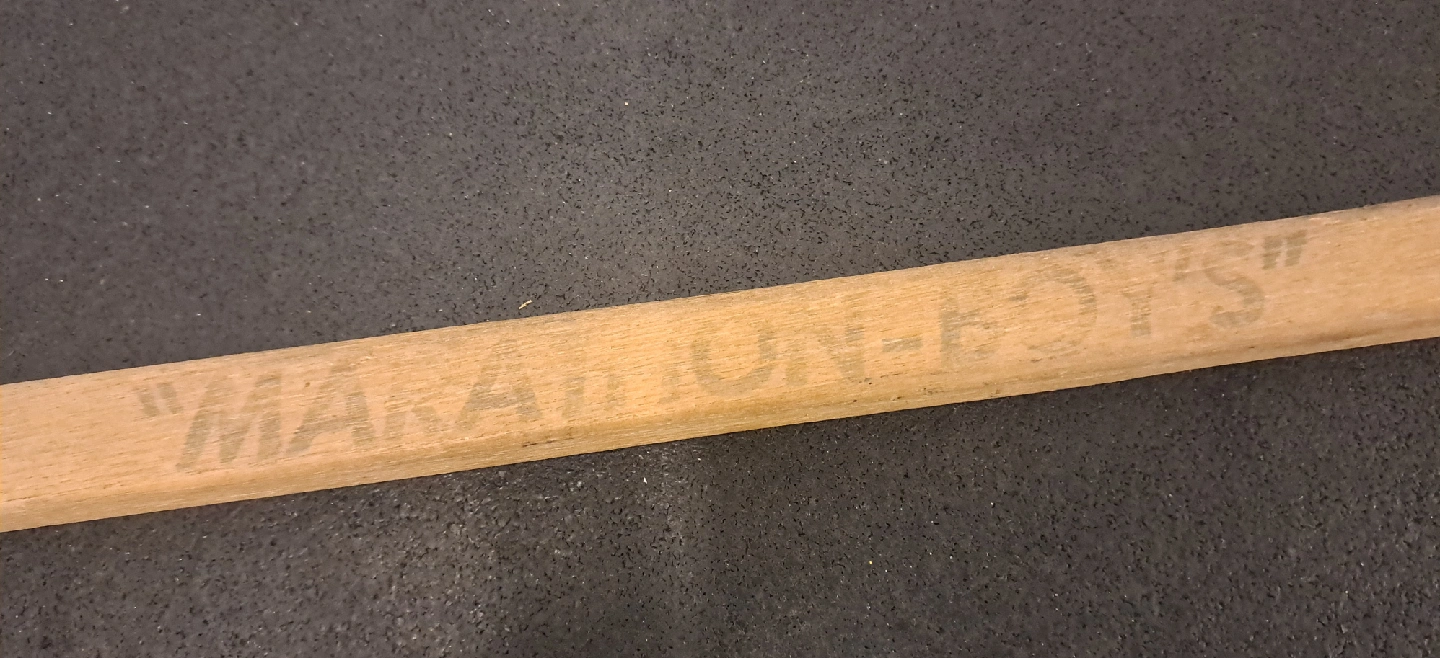Selling a vintage hockey stick with "MARATHON BOYS" printed on the shaft. It shows signs of use, with tape on the blade, but it's still a cool piece of hockey history!