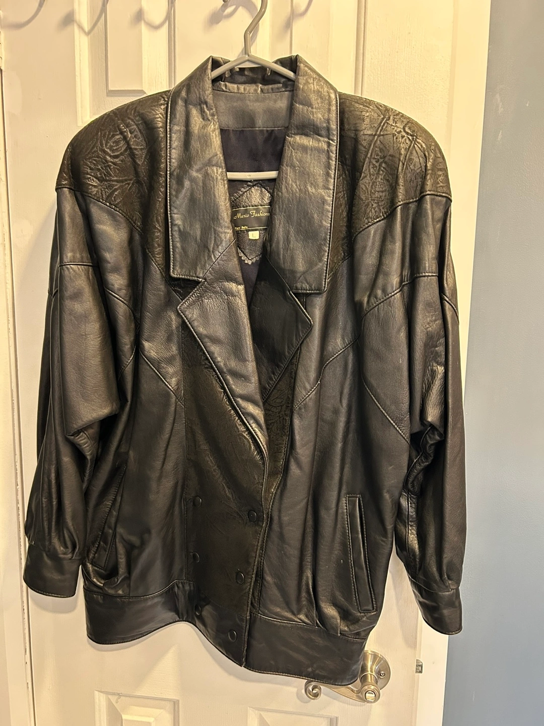 1000+A vintage black leather jacket. Features interesting textured designs on the shoulders and back. Double-breasted with two front pockets. Perfect for layering up on a cool evening. Kept in protective bag and in amazing condition