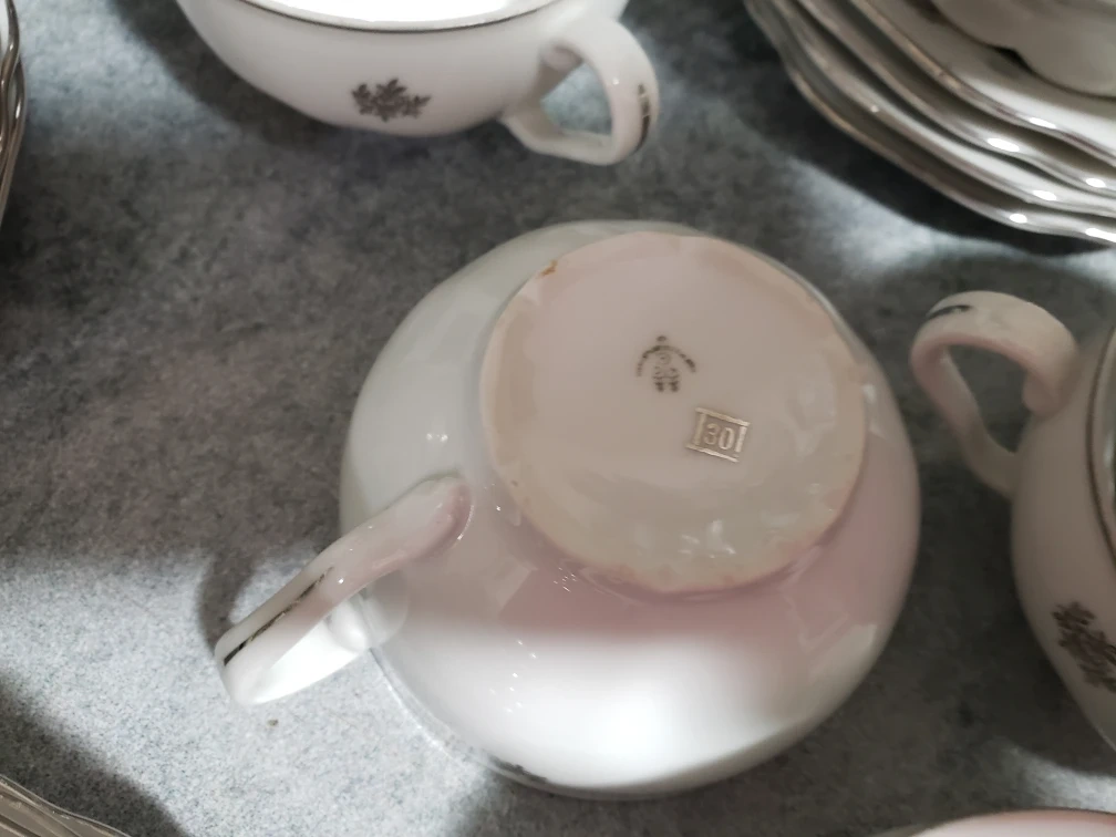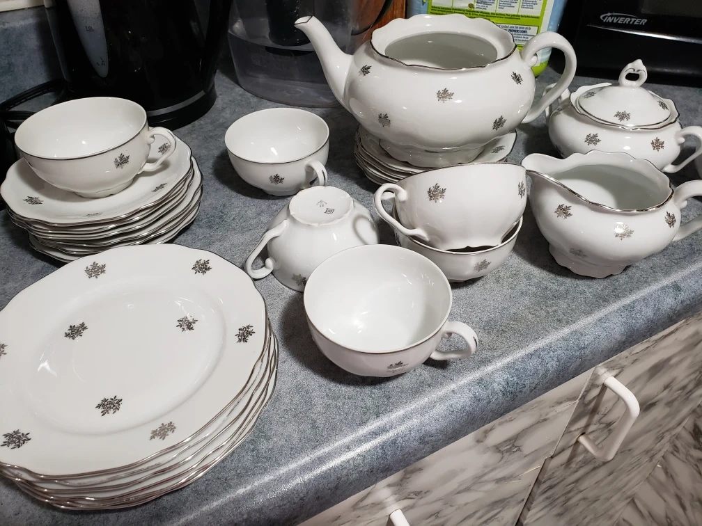 122Selling a beautiful vintage tea set! It features a delicate silver maple leaf design on a white background. Includes a teapot, sugar bowl, creamer,10 cups, and 12plates. 12 desert plates. large desert serving plates Perfect for afternoon tea or adding a touch of elegance to your dining table