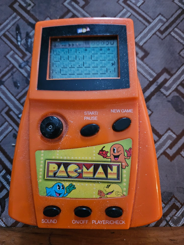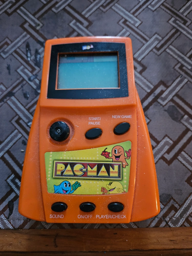 Orange handheld Pac-Man game. Features directional pad, buttons for start/pause, new game, sound, on/off, and player/check. LCD screen. Pre-owned. Cash preferred, no holds, must pick up, no price negotiation at the door