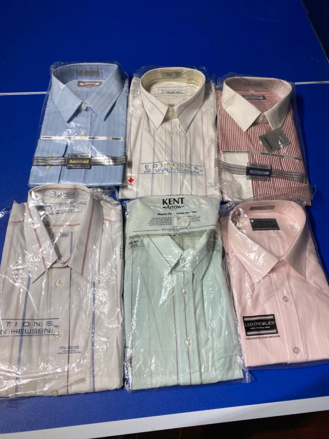 163Selling a collection of vintage men's dress shirts. They are all size 17 1/2. Brands include Woodward's, Editions by Van Heusen, Kent Arrow, and Leq Chevalier. All shirts are still in their original packaging! Pickup from Richmond. Must take all.