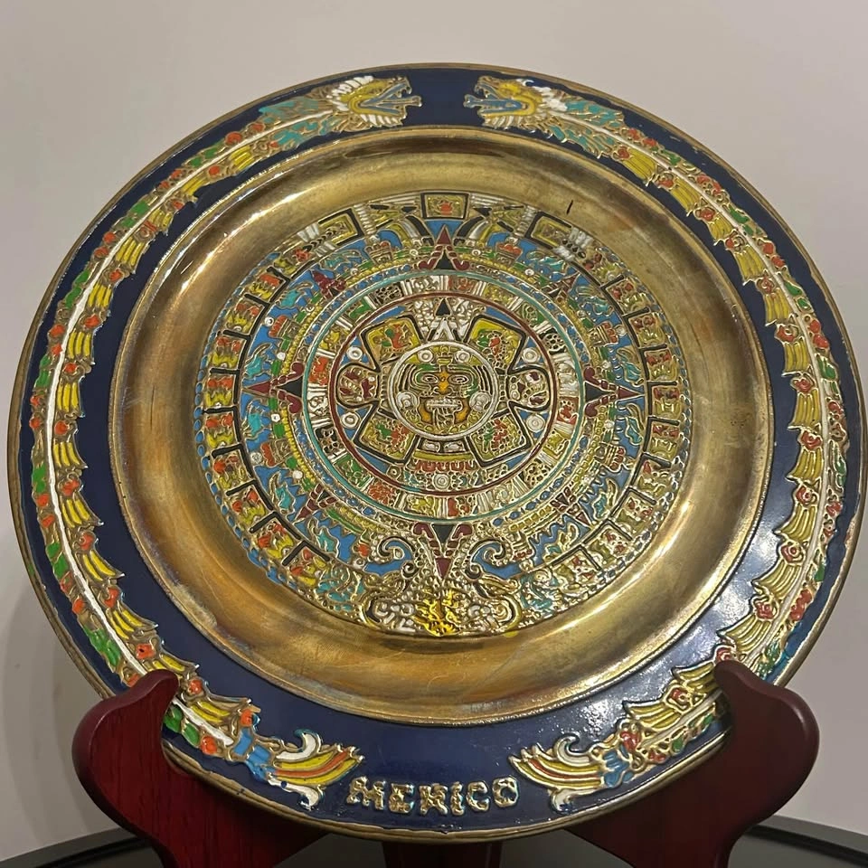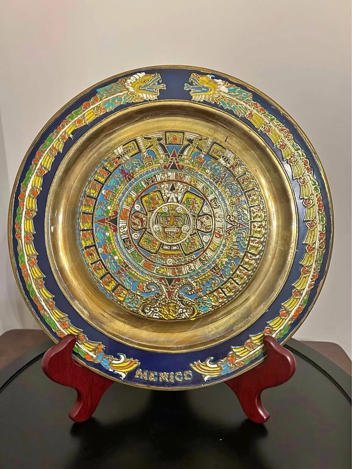 Vintage decorative brass plate with colorful enamel inlay featuring the famous Aztec calendar design. The rim is decorated with detailed mythological motifs and vibrant colors. Marked Mexico at the bottom. A unique cultural collectible and striking display piece. Plate stand in photos is for presentation only and not included. Pick up: Seton area, Calgary. See also my other lots. Open to your questions and suggestions. If necessary, I provide additional photos. These are not new things, so please look carefully at the photos and videos. Sizes are submitted on request and also using a tape measure in the photo.