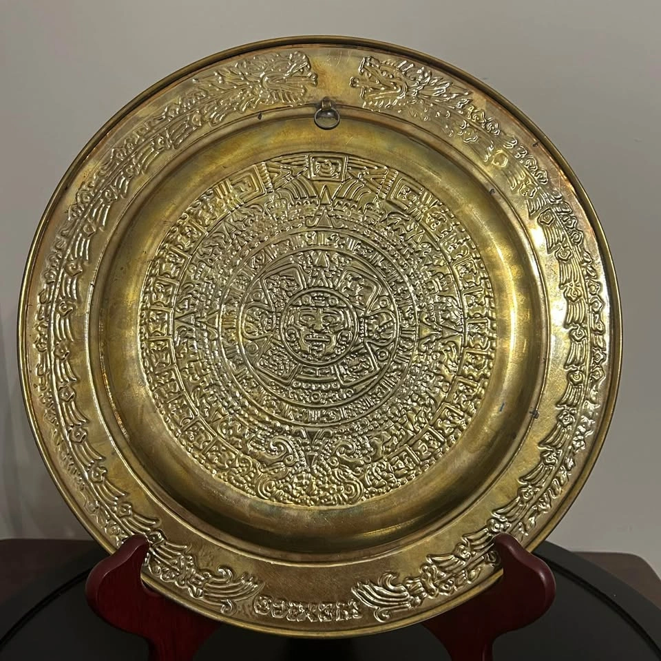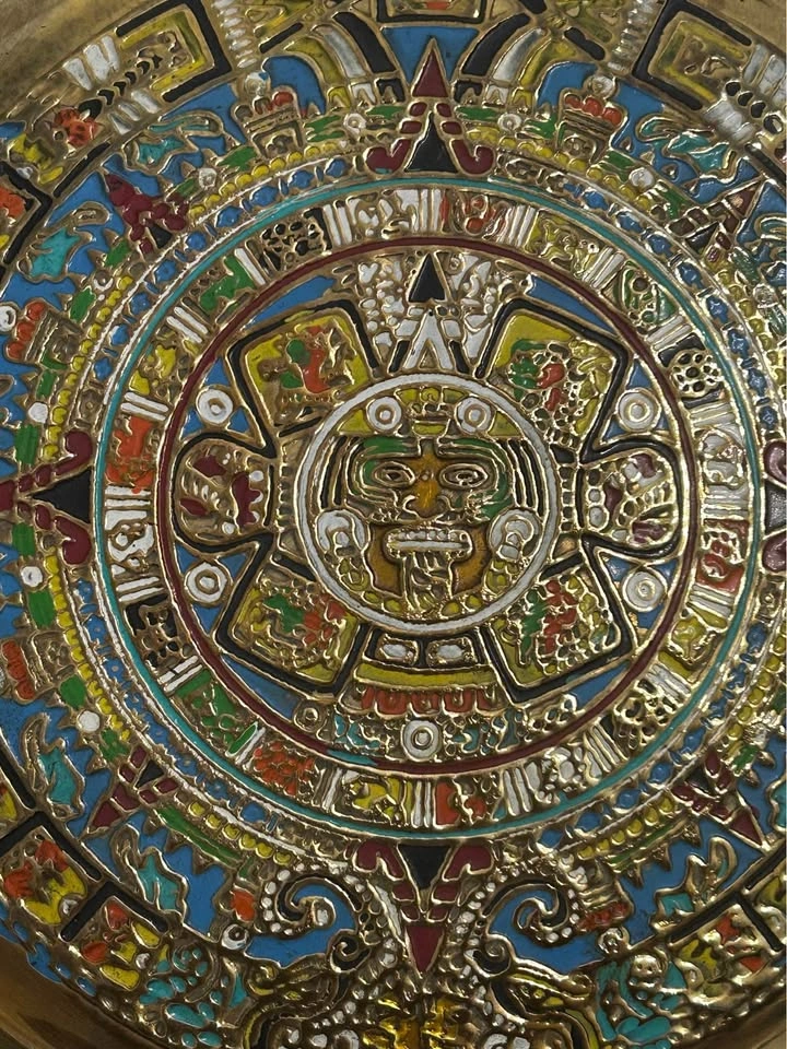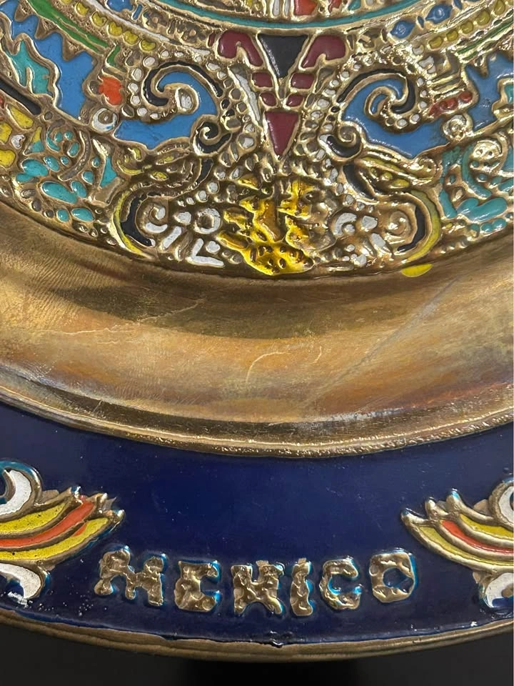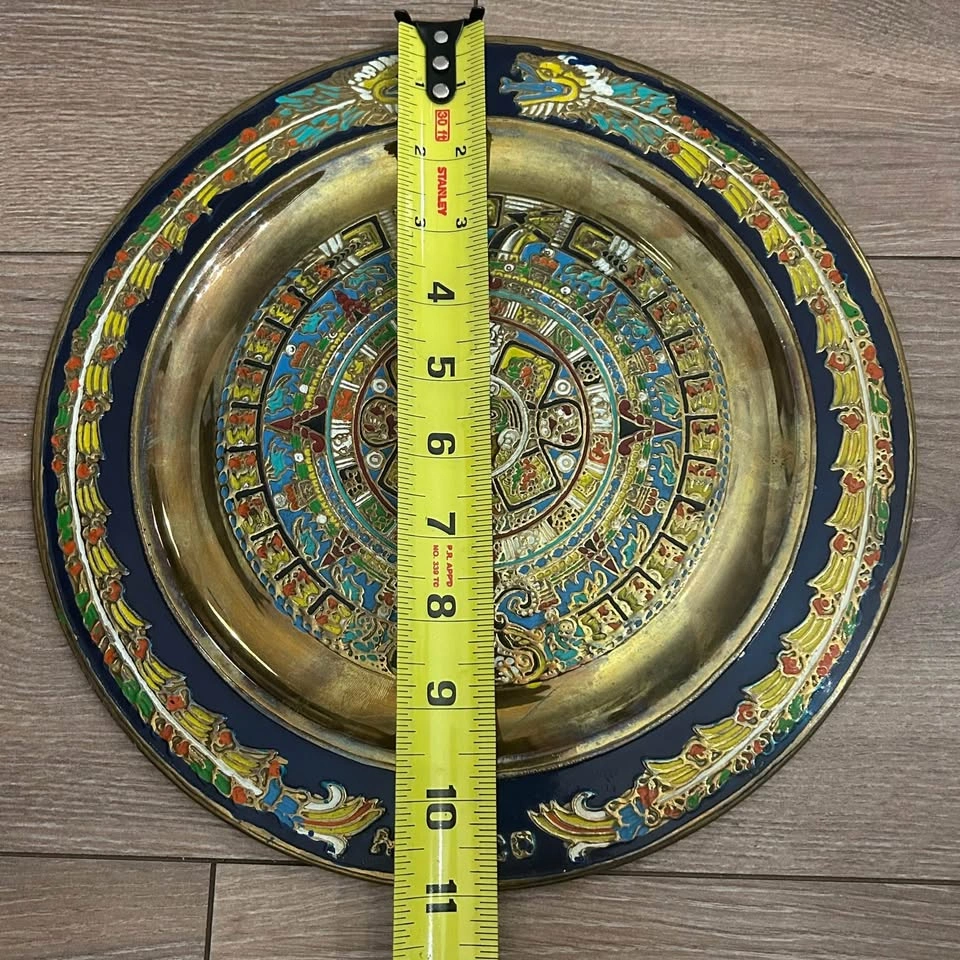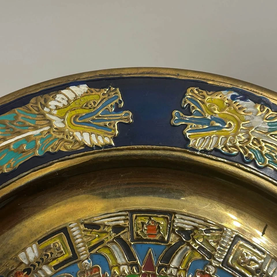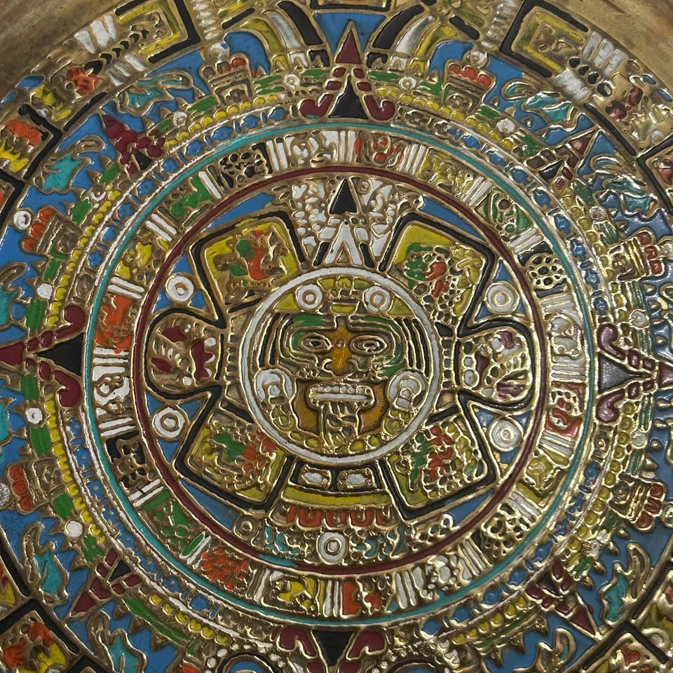 Vintage Mexican Brass & Enamel Aztec Calendar Plate 11”