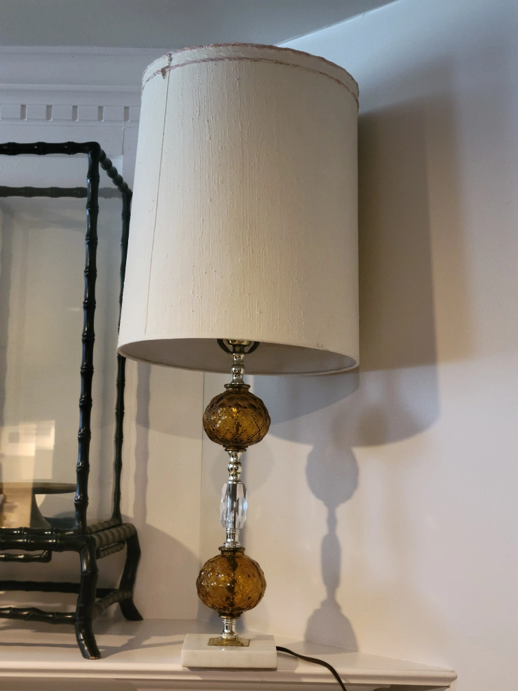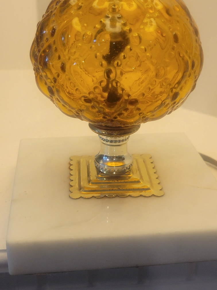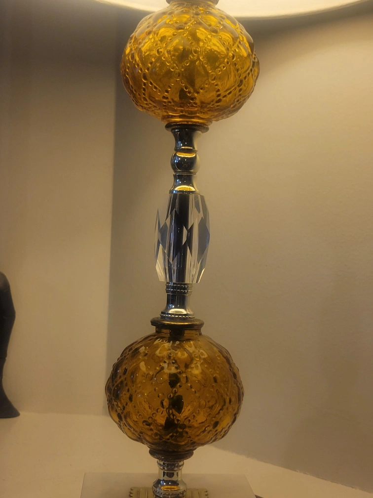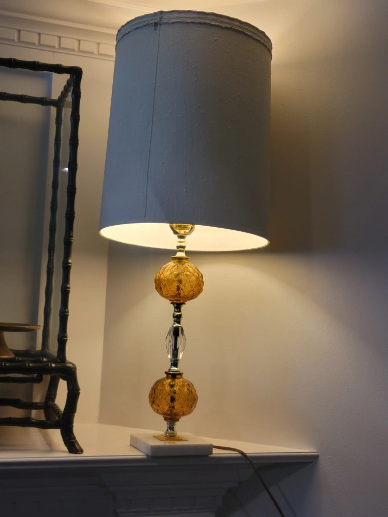 Add a touch of mid-century modern elegance to your home with this vintage table lamp. Featuring amber glass orbs, crystal accents, and a marble base, this lamp stands approximately 30 inches tall. It's in good condition and ready to light up your space. * **Style**: Mid-Century Modern * **Material**: Glass, Crystal, Marble * **Height**: Approximately 30 inches The Lampshade has been painted by previous owner. Fennell and Upper gage Hamilton Asking $120 Please check out my many estate listings