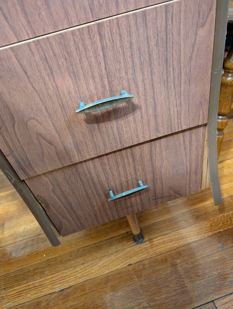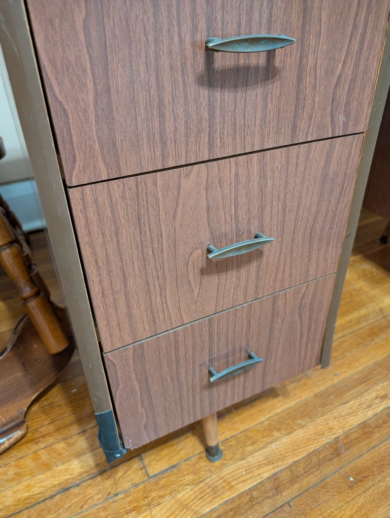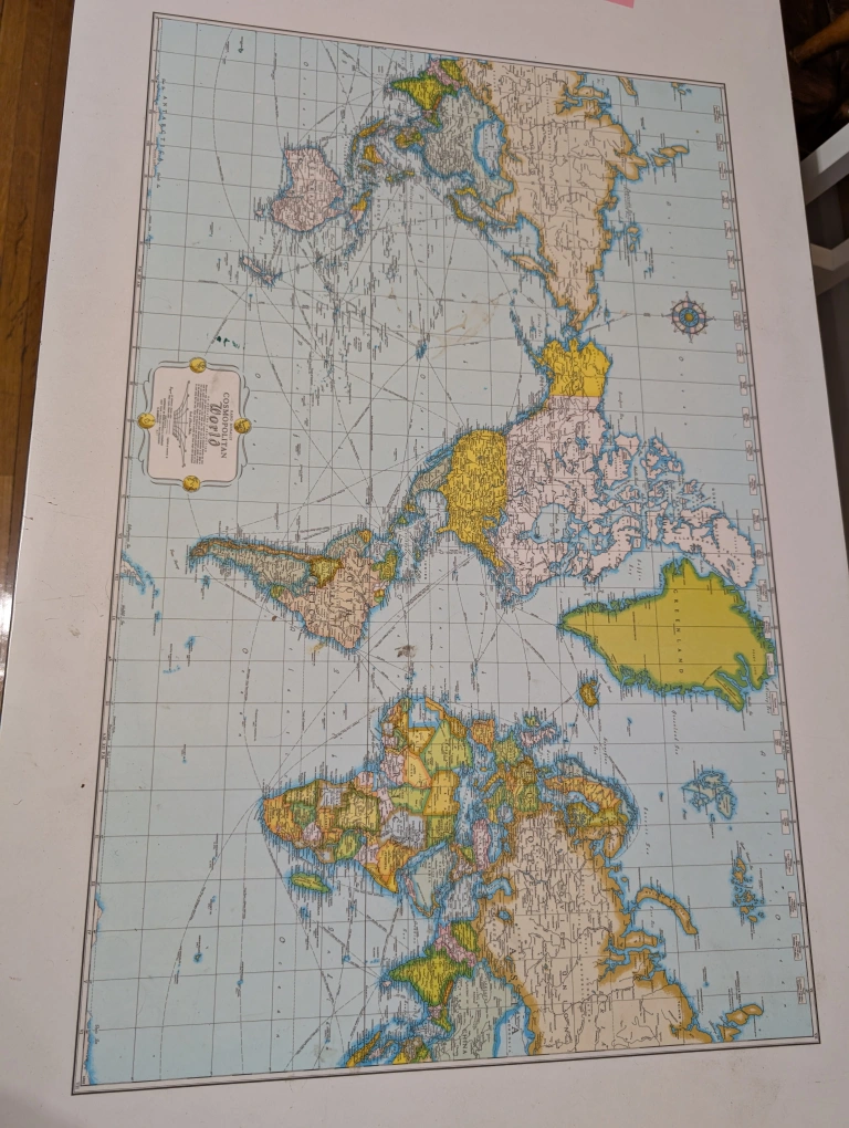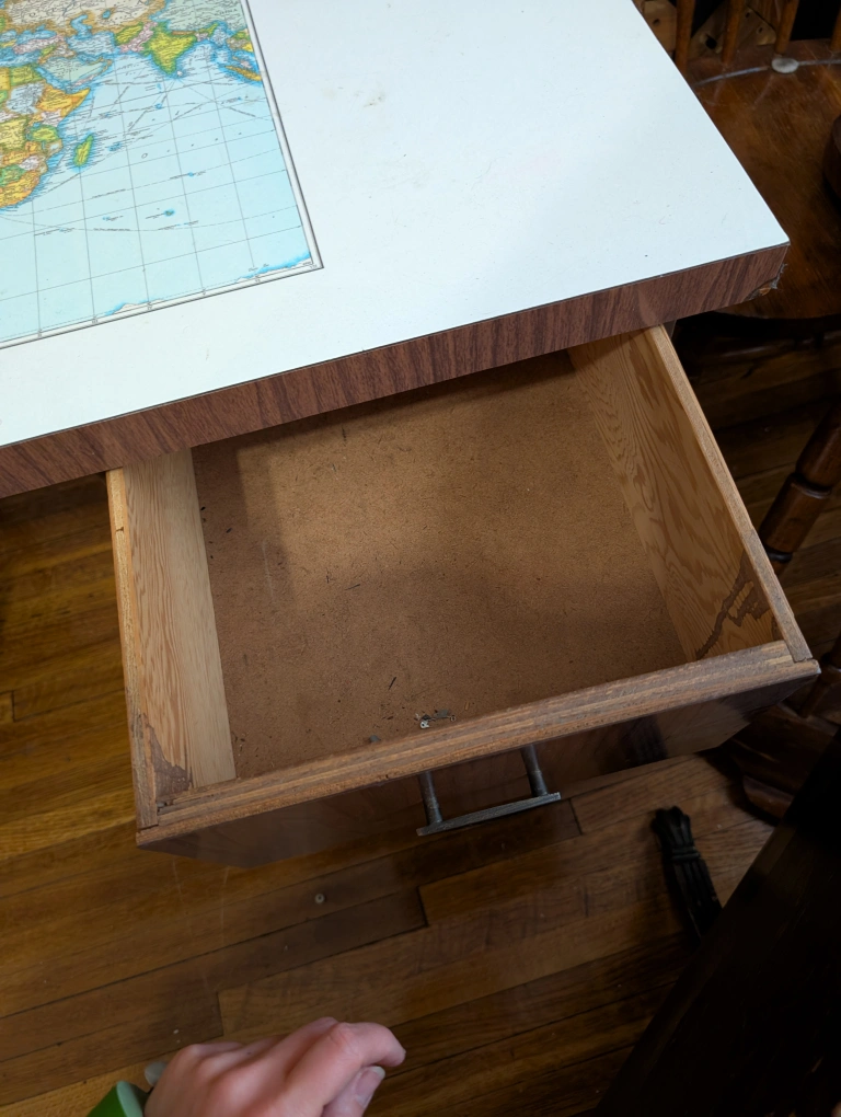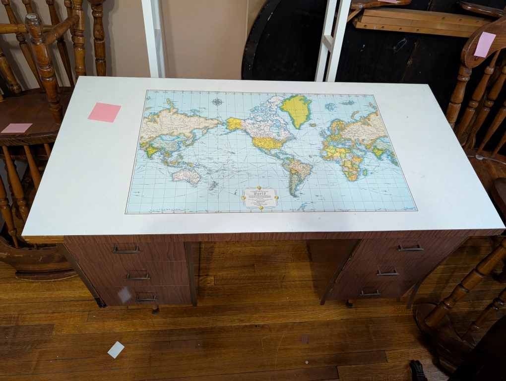 Unique vintage desk. Features a laminated world map on the desktop. Four drawers. Mid-century modern style. Some wear consistent with age and use.