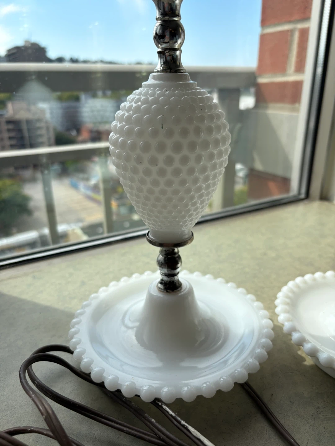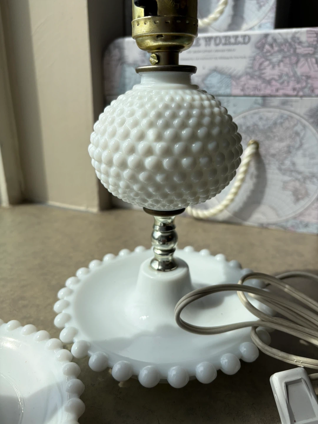72Selling a set of three vintage milk glass hobnail lamps. These lamps have a unique, textured design and are in great condition. They would add a charming, vintage touch to any room.