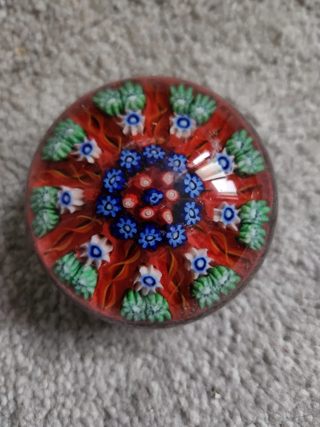 10This is a beautiful vintage millefiori glass paperweight. It features a complex floral design with vibrant colours, encased in clear glass. It's in great condition and ready to add a touch of elegance to your desk or collection