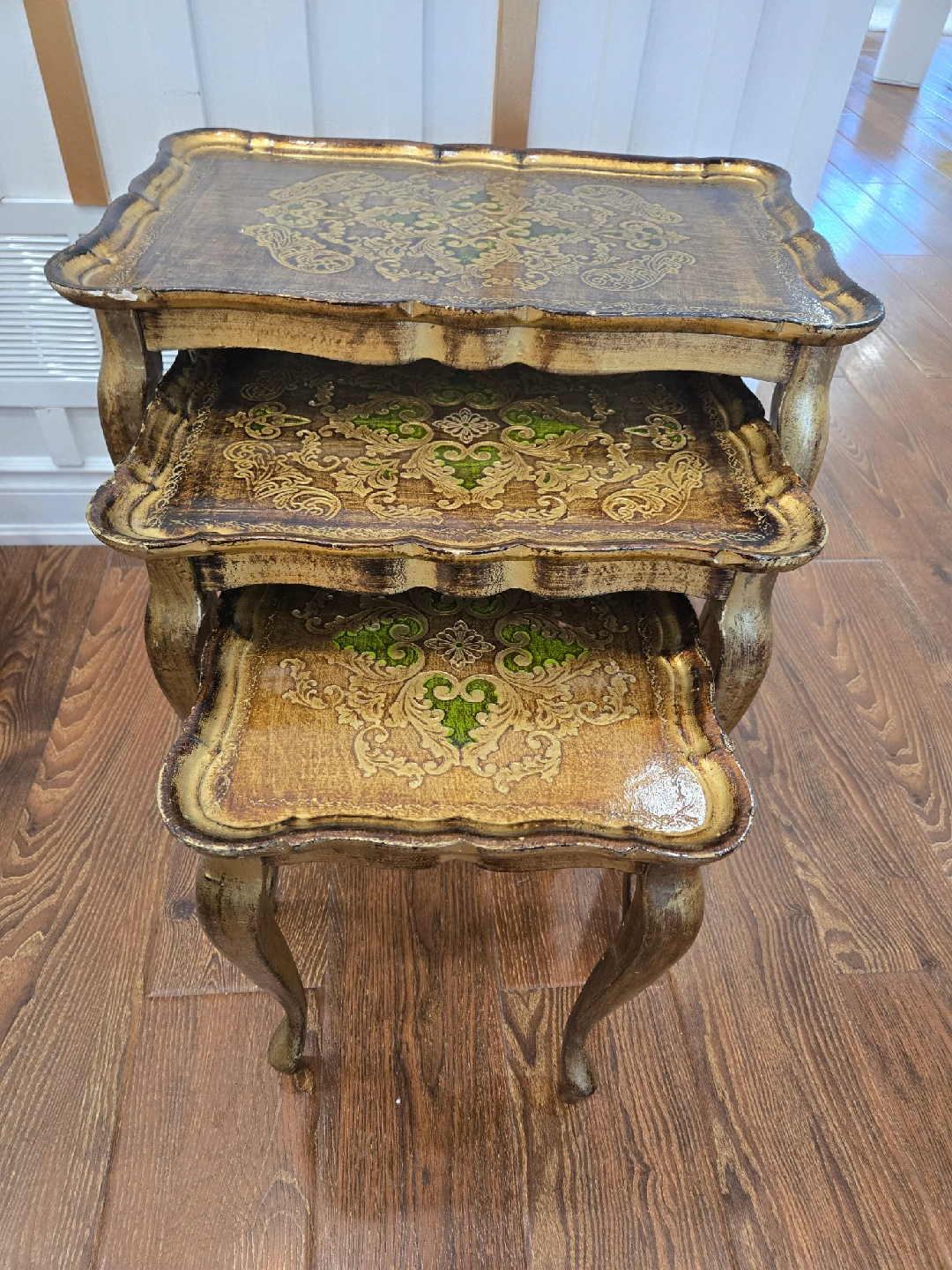 These are a set of three vintage nesting tables. They have a unique gold and green design. There are some signs of wear and tear, but they're still a beautiful addition to any home!
