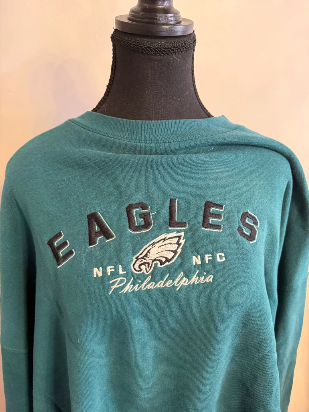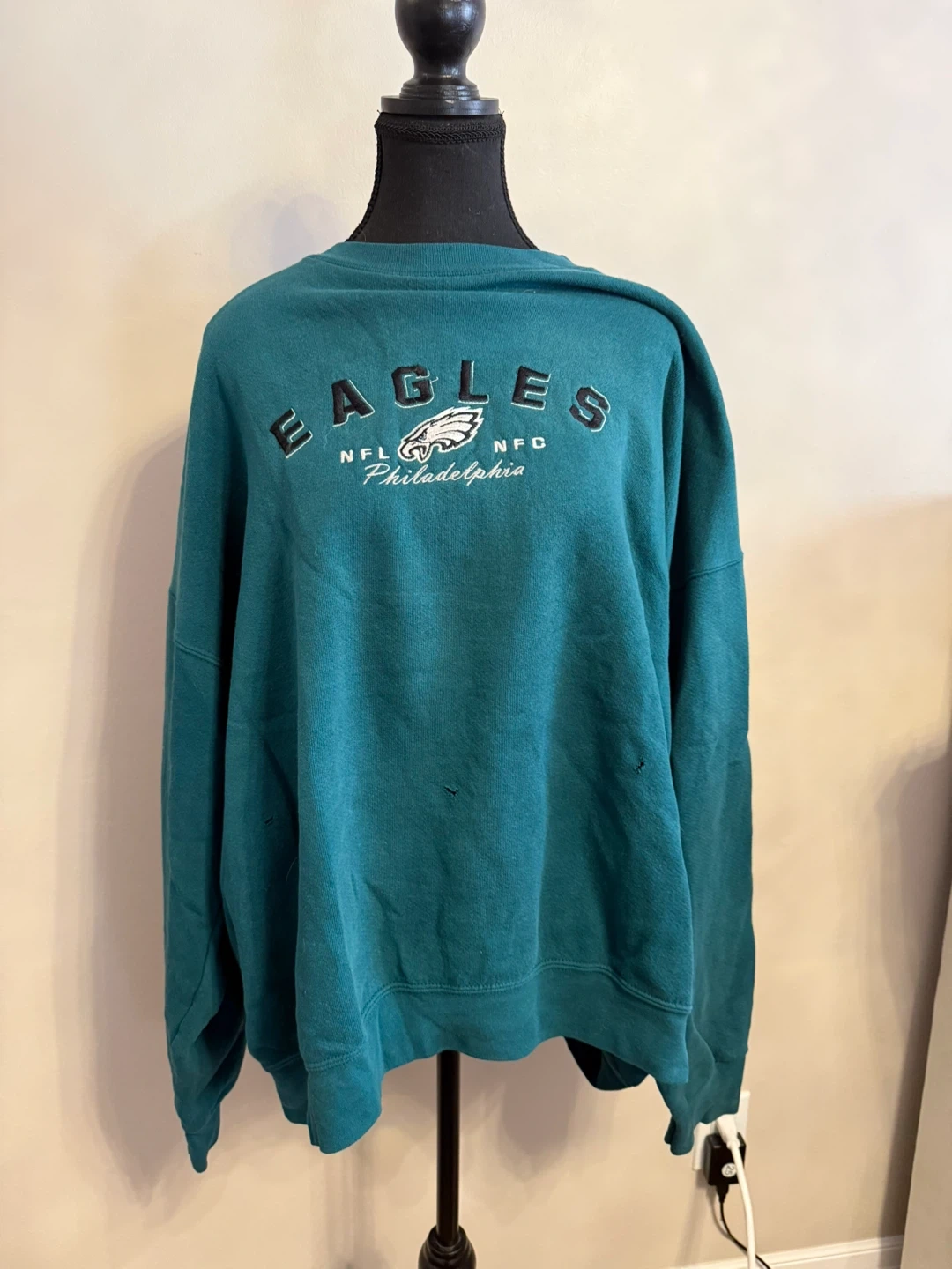 Selling a vintage NFL Eagles crewneck sweatshirt in size 2XL. It's green with the Eagles logo on the front. Fits more towards a large than 2XL Please note there are some small holes in the front of the sweatshirt.