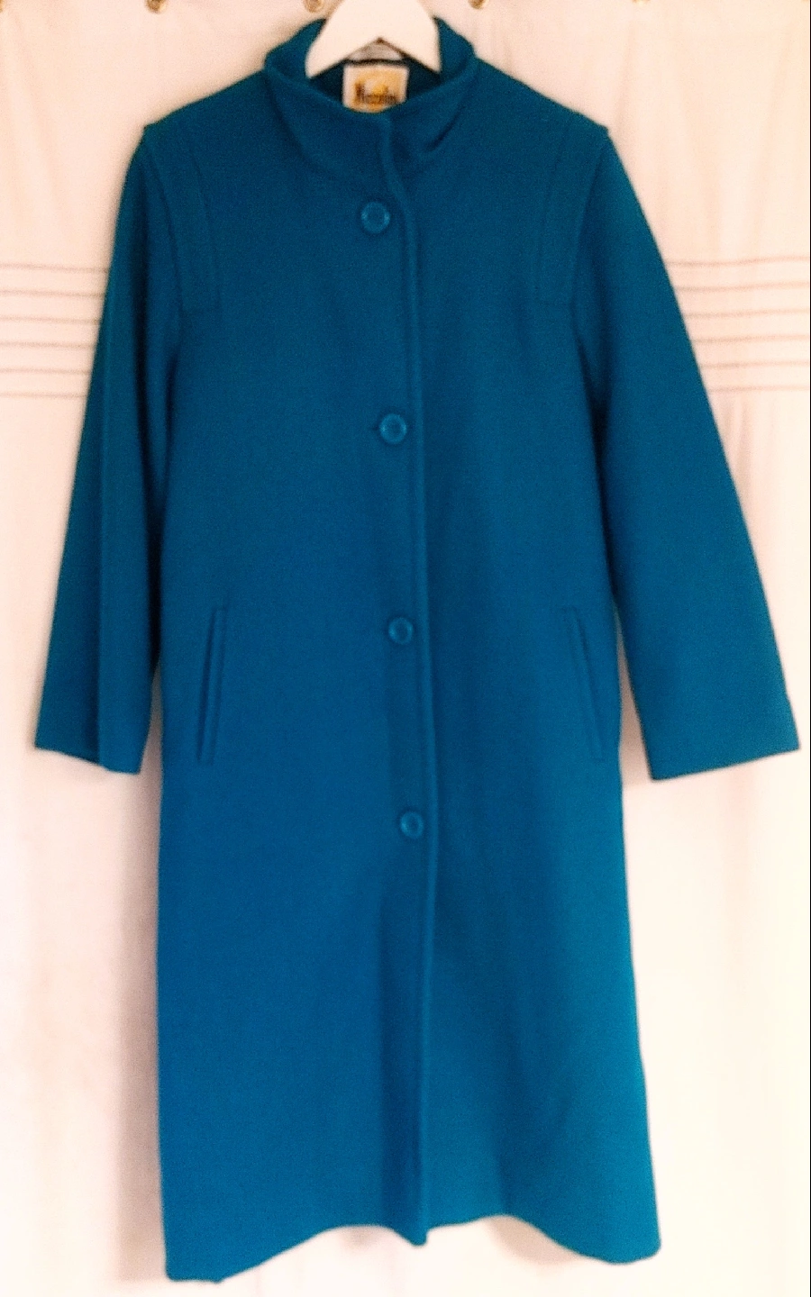 86Womens vintage teal wool coat by Niccolini, made in Canada. Coat has a button down front and waist belt. All buttons present and 2 pockets on the front. Coat is in good condition. Does have a few small marks that dry cleaning would probably remove. Guessing late 70's/early 80's. 47 inches long/ 23 inches shoulder to cuff. Smoke free home pick up Mt.Brydges cash only.