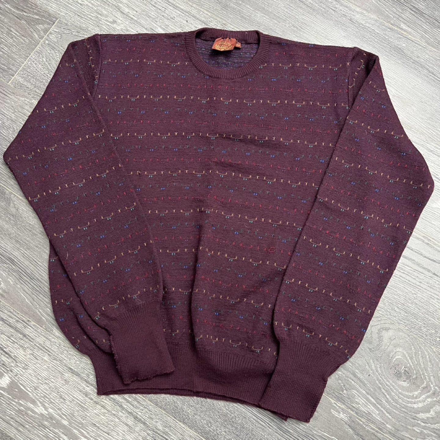 97Beautiful burgundy color with multicolor speckles. Made of 100% merino wool — soft, warm, and lightweight. Condition: Fair vintage condition (about 5/10). There is a visible hole on the back (as shown in the photo). Still wearable or great for repair/rework projects. Perfect for those who love authentic vintage pieces with character. Material: 100% Merino Wool Made in Italy Note: Price reflects the vintage condition. Please check all photos carefully before purchasing.