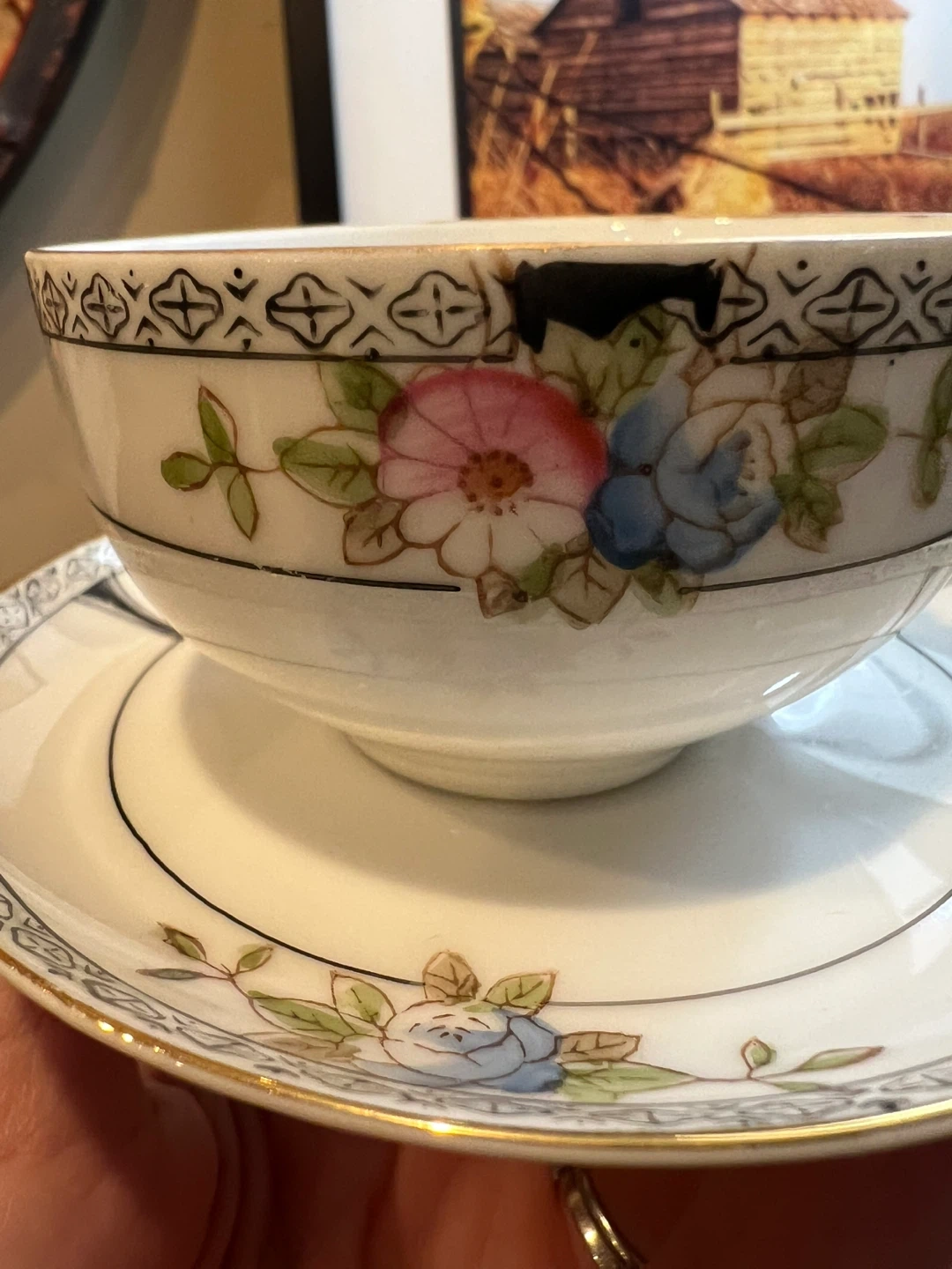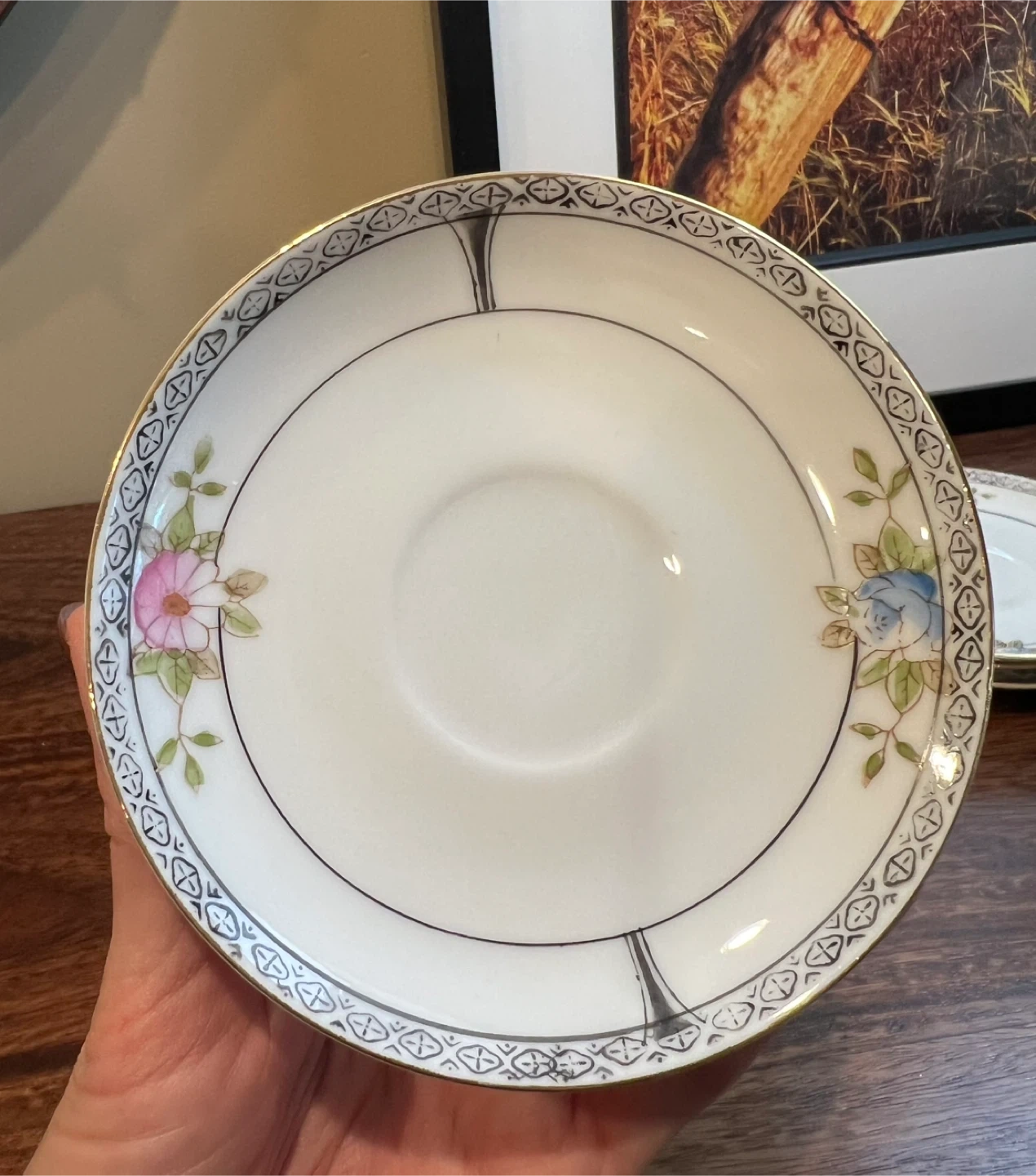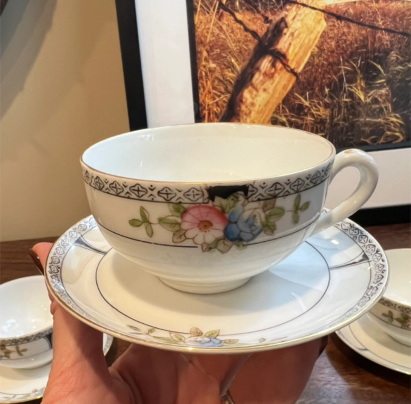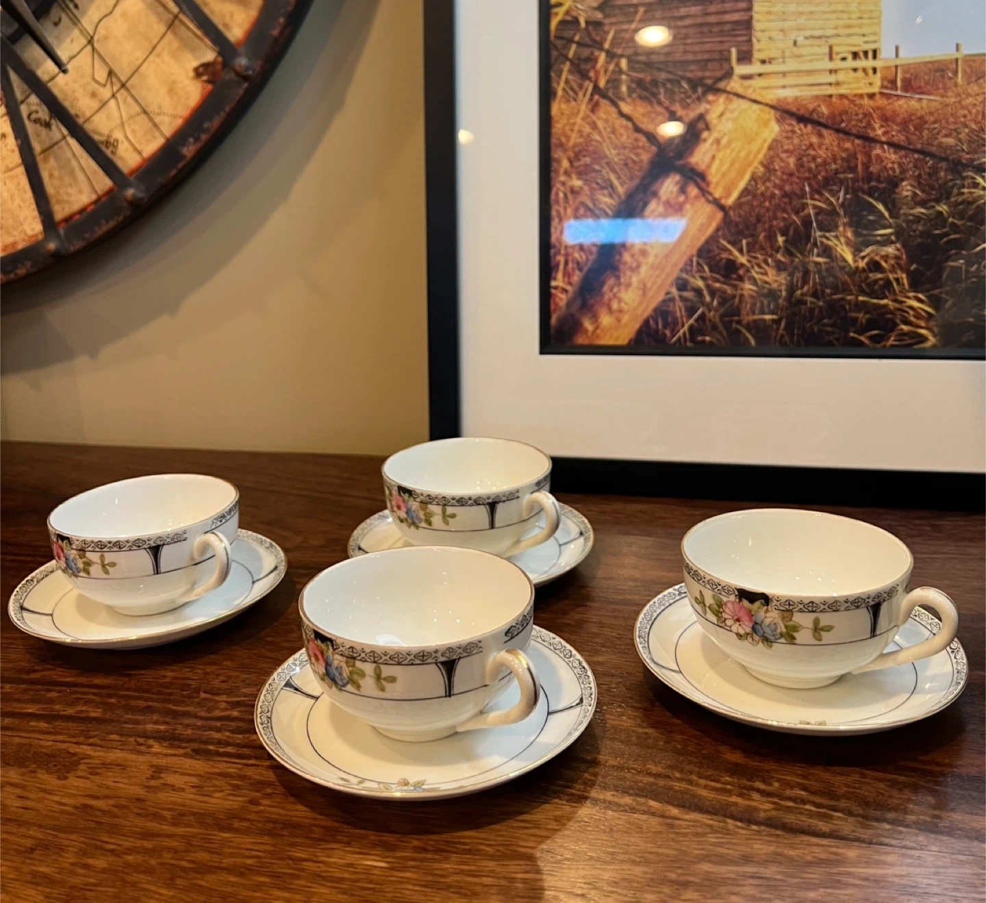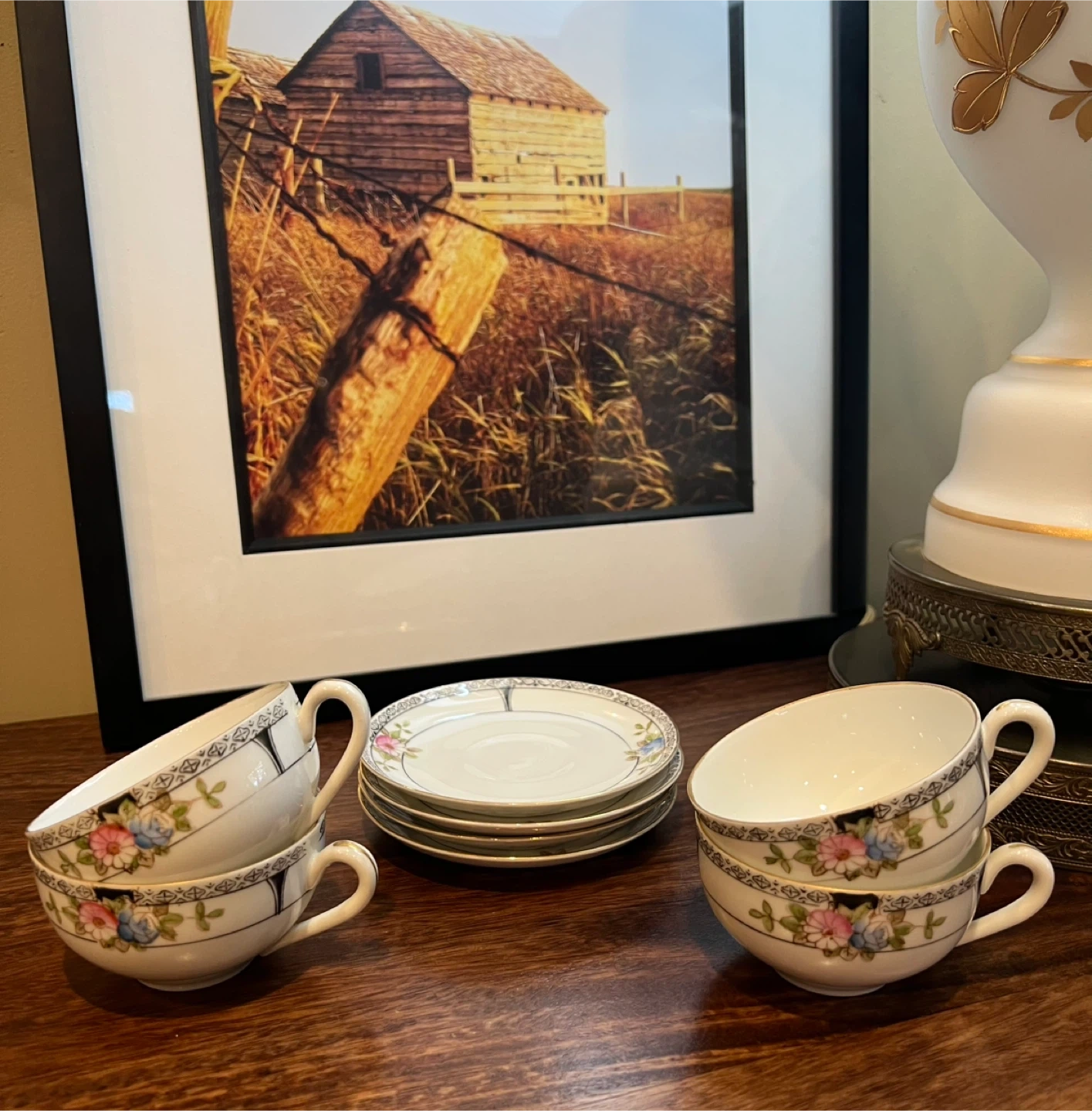 579Delicate white porcelain with a blue & pink flowers and Art Nouveau decorative touches 4 teacups and matching saucers Stamped Noritake Handpainted Made in Japan Indicating their authenticity and vintage appeal Great vintage condition (no chips, no cracks, no crazing) Asking $10 for the entire set Interested ? Message me and please check my other listings…