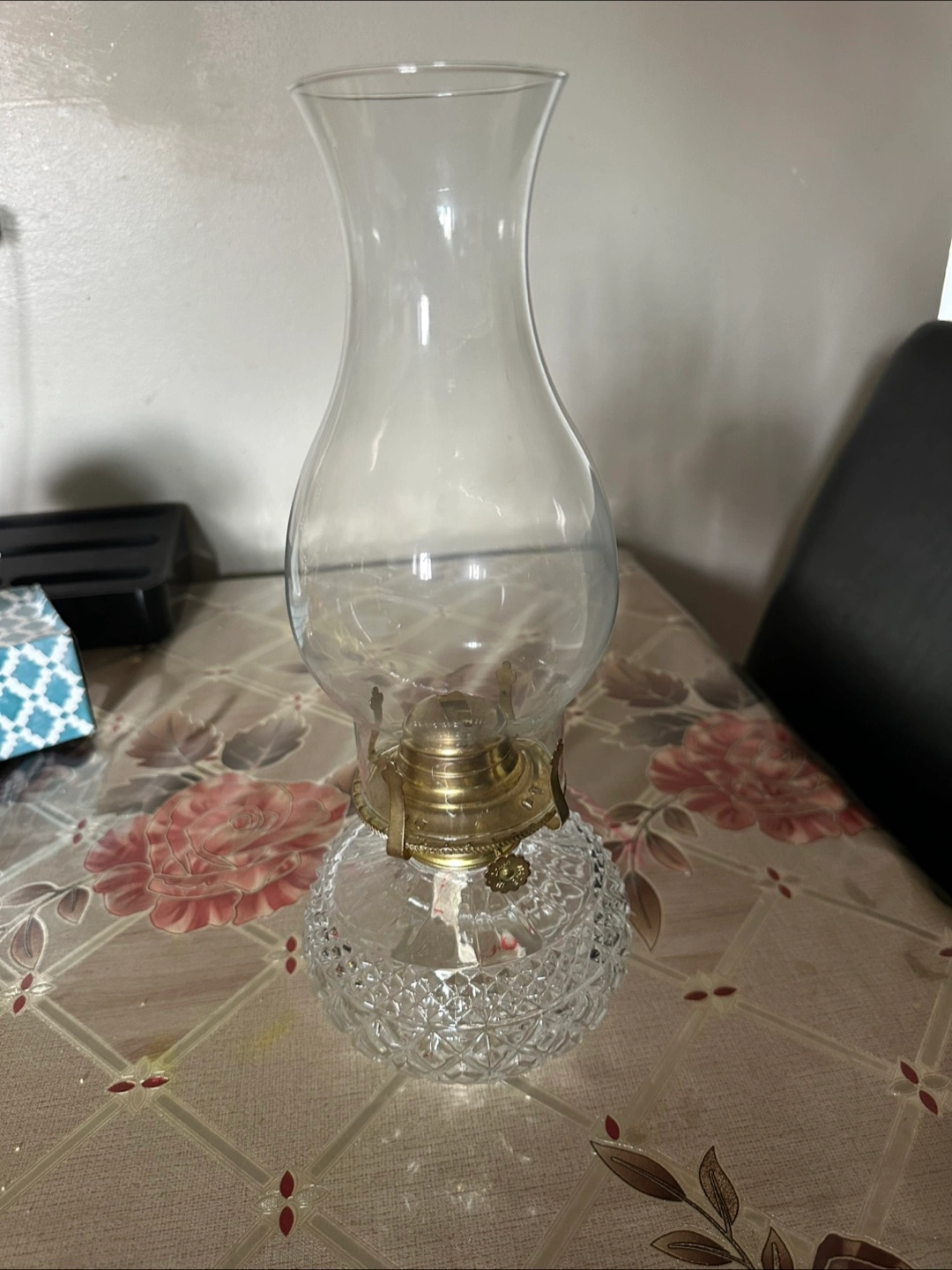 Clear glass oil lamp. Features a beautiful, intricate base. The chimney is a classic shape. Perfect for creating a cozy ambience.